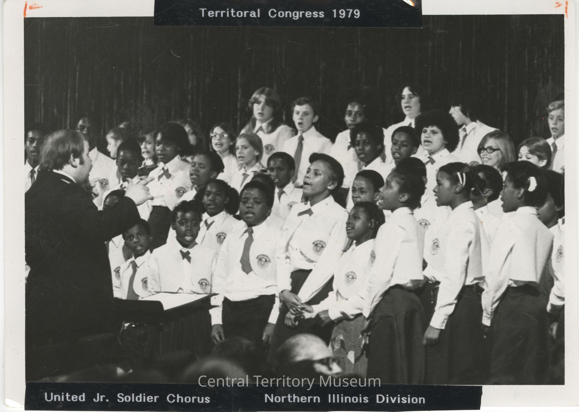 Photo of some of the United Junior Soldier Chorus and Northern Illinois Divisional Music Director Karl Strand performing during the 1979 Central Territory Congress. Strand is seen in the lower left corner, back towards the photographer, facing a large group of boys and girls. The children are wearing Salvation Army uniforms (white shirts, dark pants or skirts) with the boys wearing ties and the girls wearing bow ties.