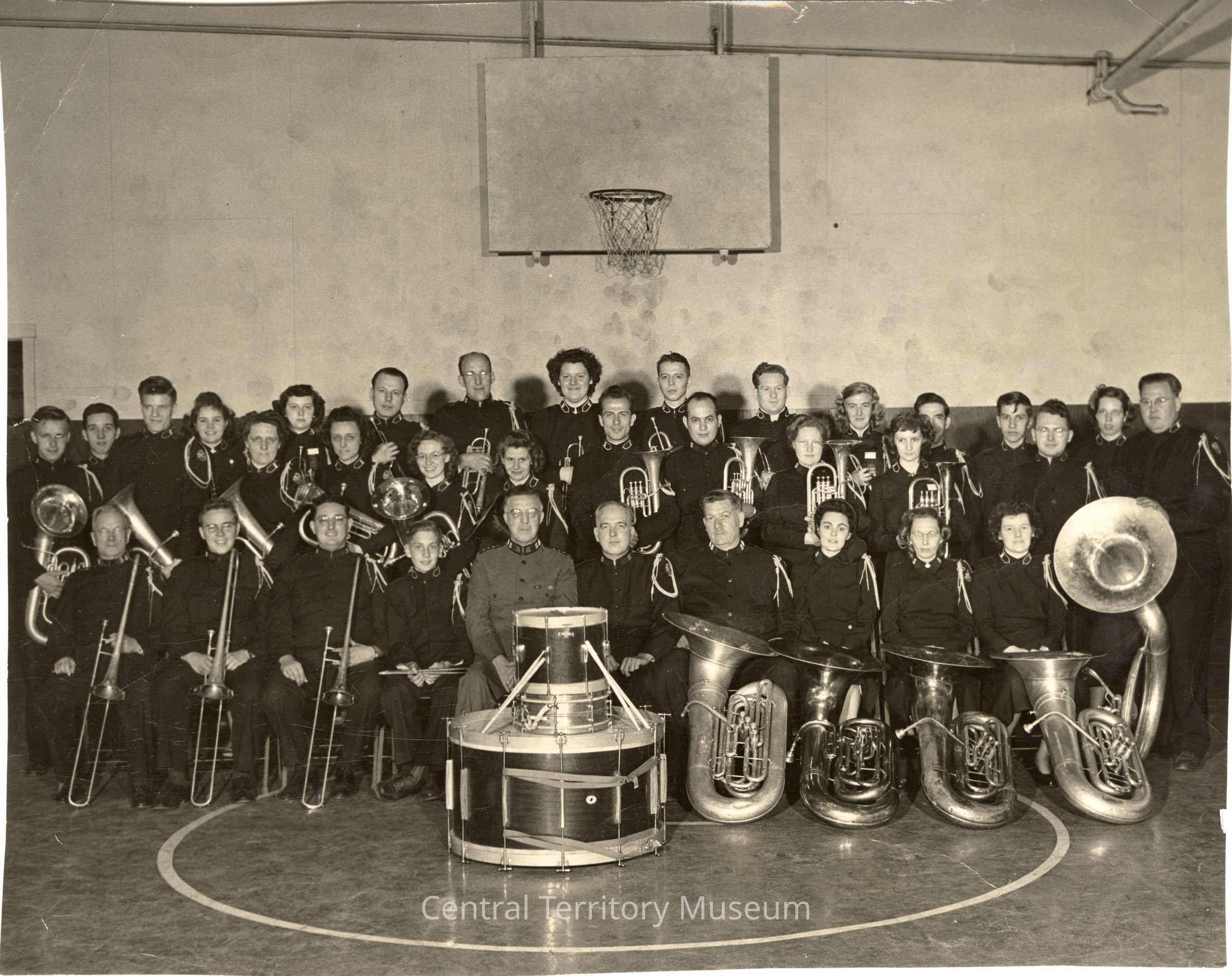 Photo of the Iowa Division Band at Des Moines, Iowa in 1949. The group includes men, boys, girls, and women all dressed in Salvation Army uniforms arranged in a gymnasium. A basketball hoop can be seen over their heads. The largest brass horns are lined up in the first row, to the right of a stack of drums, including a large bass drum.Acquisition