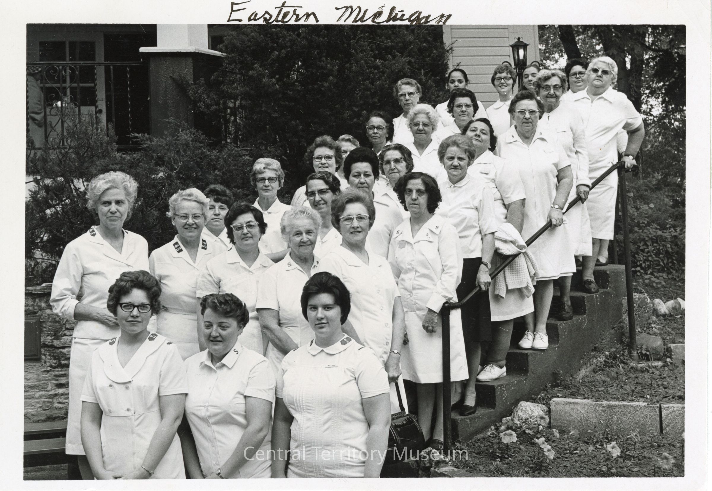 Photo of the women from the Eastern Michigan Division Home League, taken outside of the McIntyre Chapel at Wonderland Camp in Wisconsin. The women, all wearing white uniforms, are arranged on the ground and up a staircase in front of the chapel