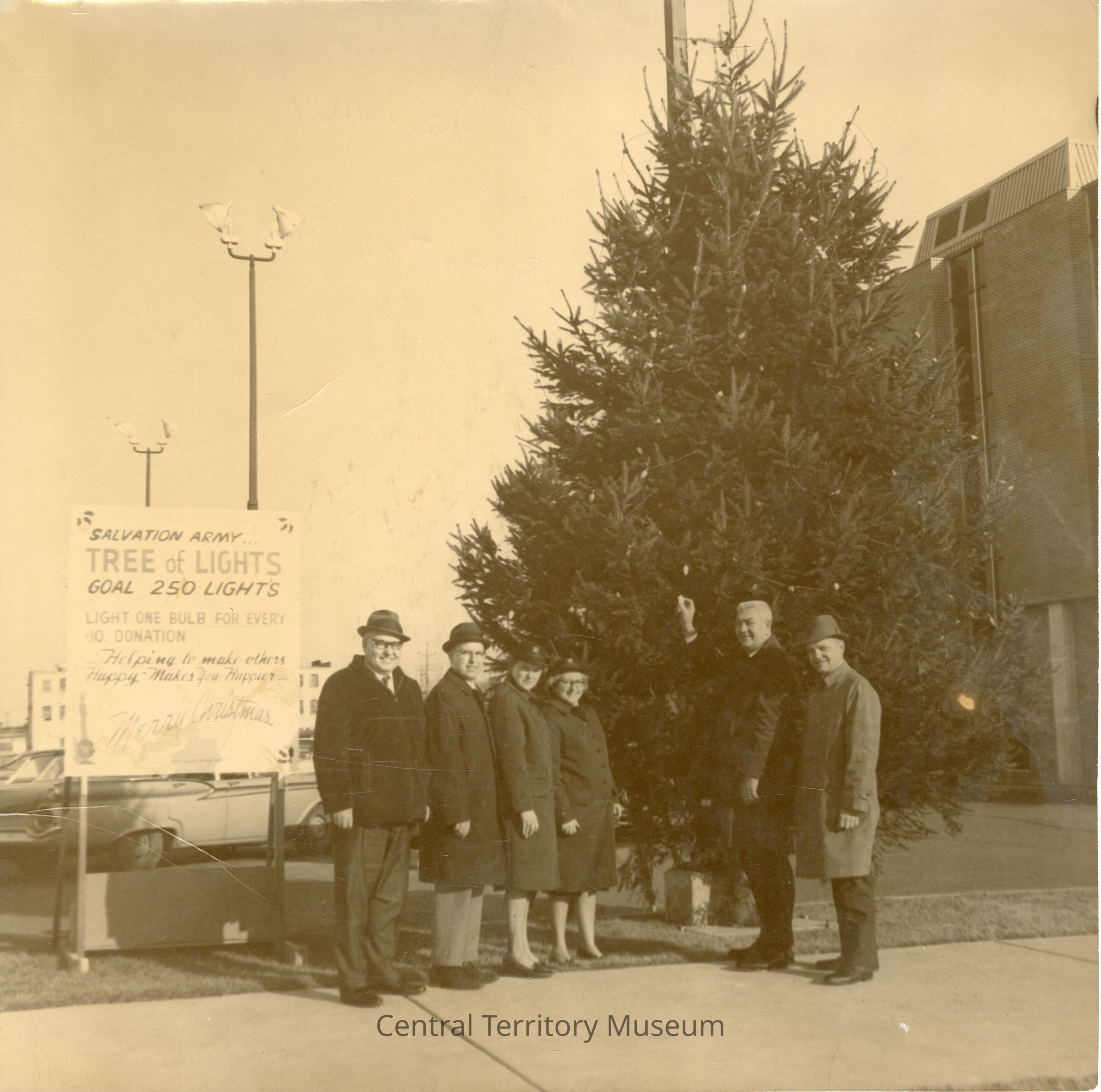 Photo of a group of men and women, standing in front of a decorated evergreen tree. A signboard, on the left, reads: Salvation Army Tree of Lights / Goal 250 Lights / Light One Bulb For Every $10 Donation / Helping to Make Others Happy Makes You Happier / Merry Christmas.
