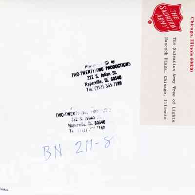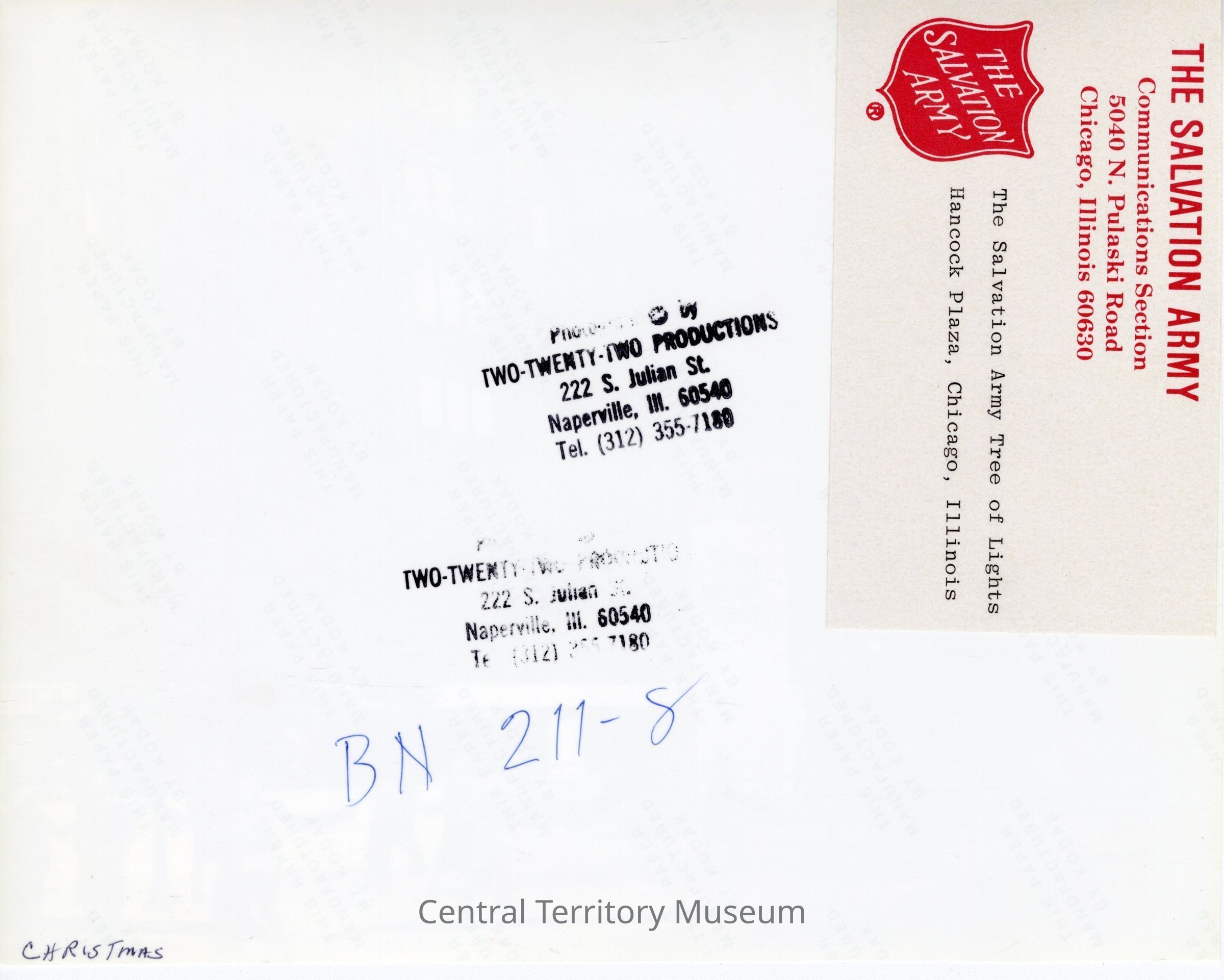 A Red Shield logo and letterhead: The Salvation Army Communications Section, 5040 N. Pulaski Road, Chicago, Illinois 60630 is printed on the label