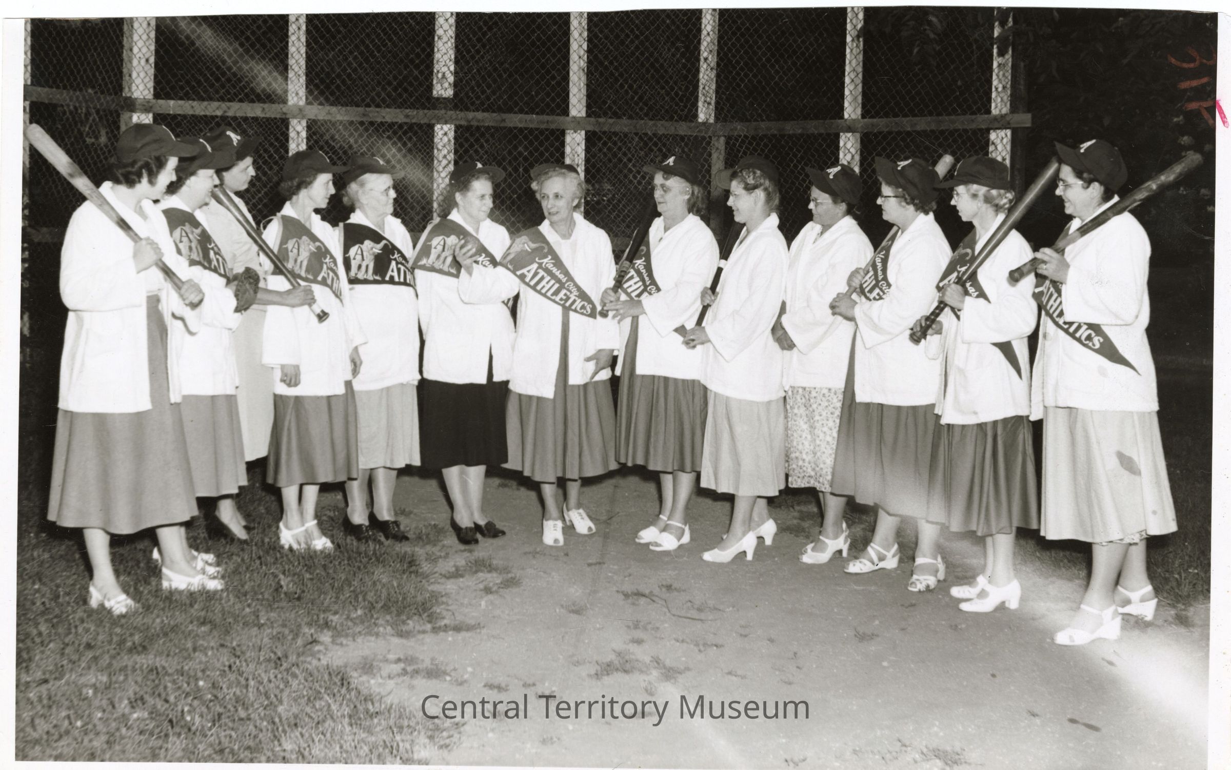 Photo of women in front of a backstop fence for a baseball field. They are wearing Kansas City Athletics team pennants over their dresses, baseball caps on their heads, and are holding baseball bats. Presumably, the women are members of The Salvation Army Home League and are participating in a divisional event. The date of the photo is based upon the logo style seen on the pennants worn by the women. The Kansas City Athletics moved to Oakland, California and are now known as the Oakland "A"s