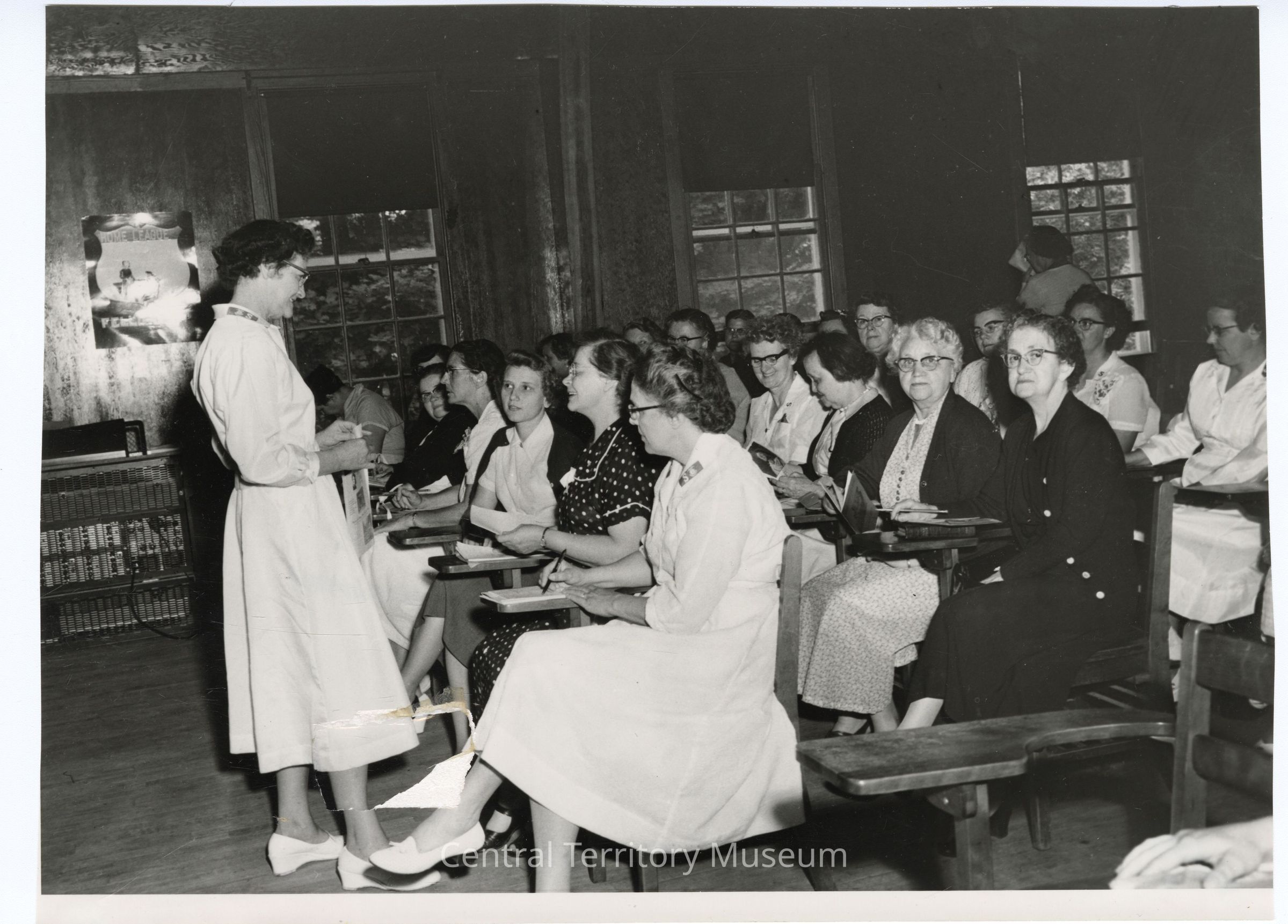 Photo of Colonel Annie Ryan and a group of women attending the 17th Home League Officers Institute at Wonderland Camp, Wisconsin. The women are inside a room, seated at desks with Colonel Ryan standing in front. A poster on the wall on the left refers to Home League Fellowship.