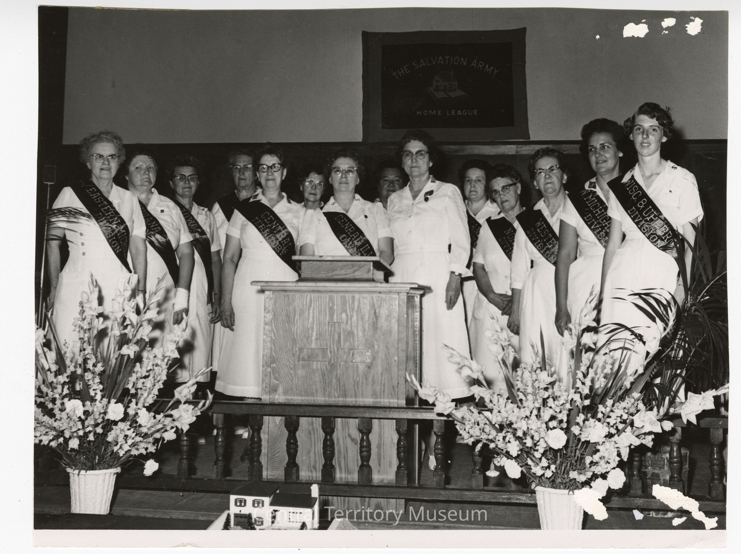 Photo of delegates at the 17th Home League Officers Institute, held at Wonderland Camp in Wisconsin. The image depicts 14 women and Colonel Annie Ryan, on stage behind a podium. Many of the women are wearing sashes imprinted with a division name and were chosen as the Local Officer of the Year by their division. The woman standing on the right side of the podium (photo left) might be Lt. Colonel Jennie Leader who was honored during the event for her service to Home League. An article about the program is printed in The War Cry, Issue 2118, August 5, 1961 on pages 18-19.