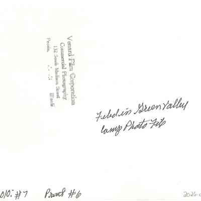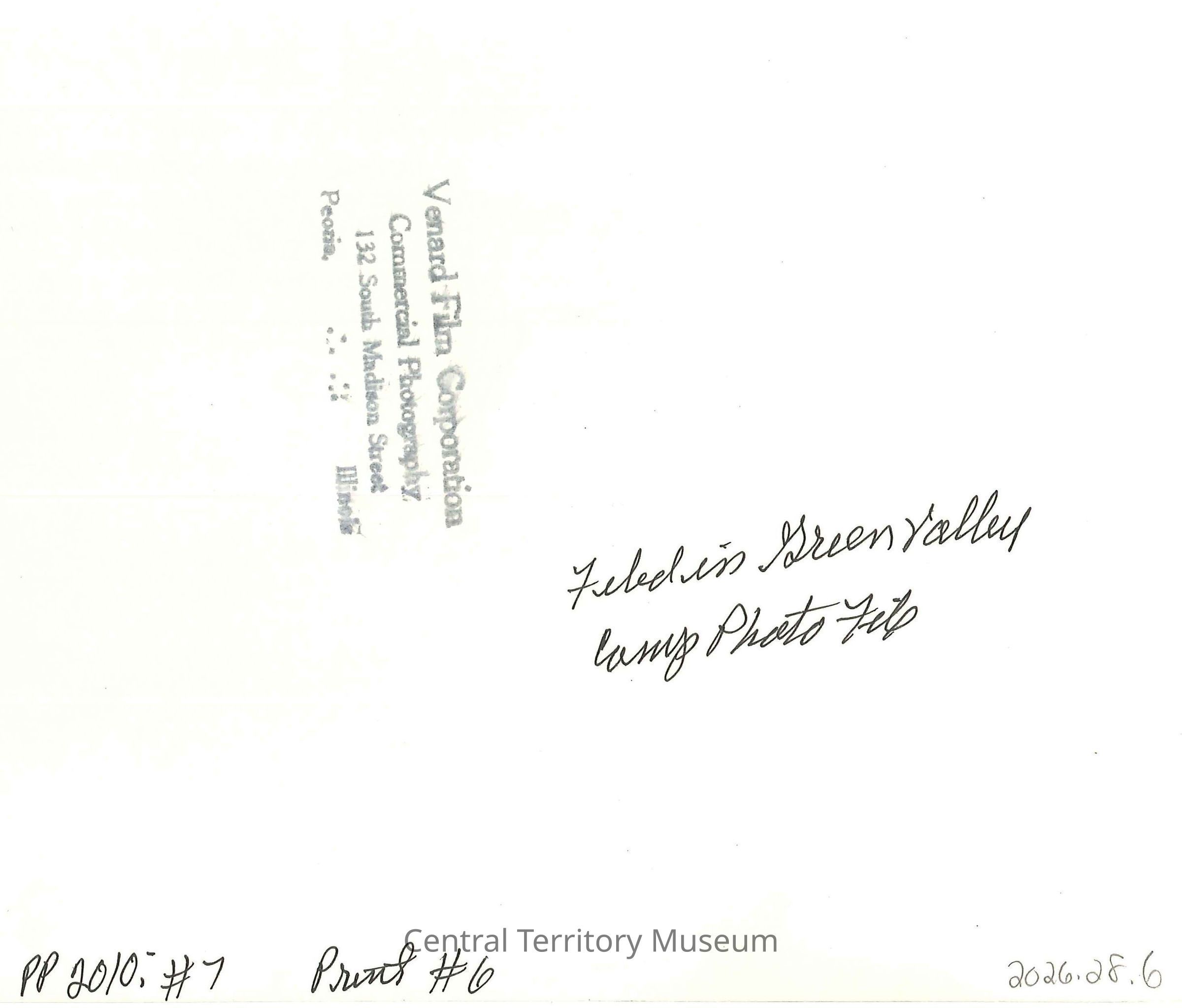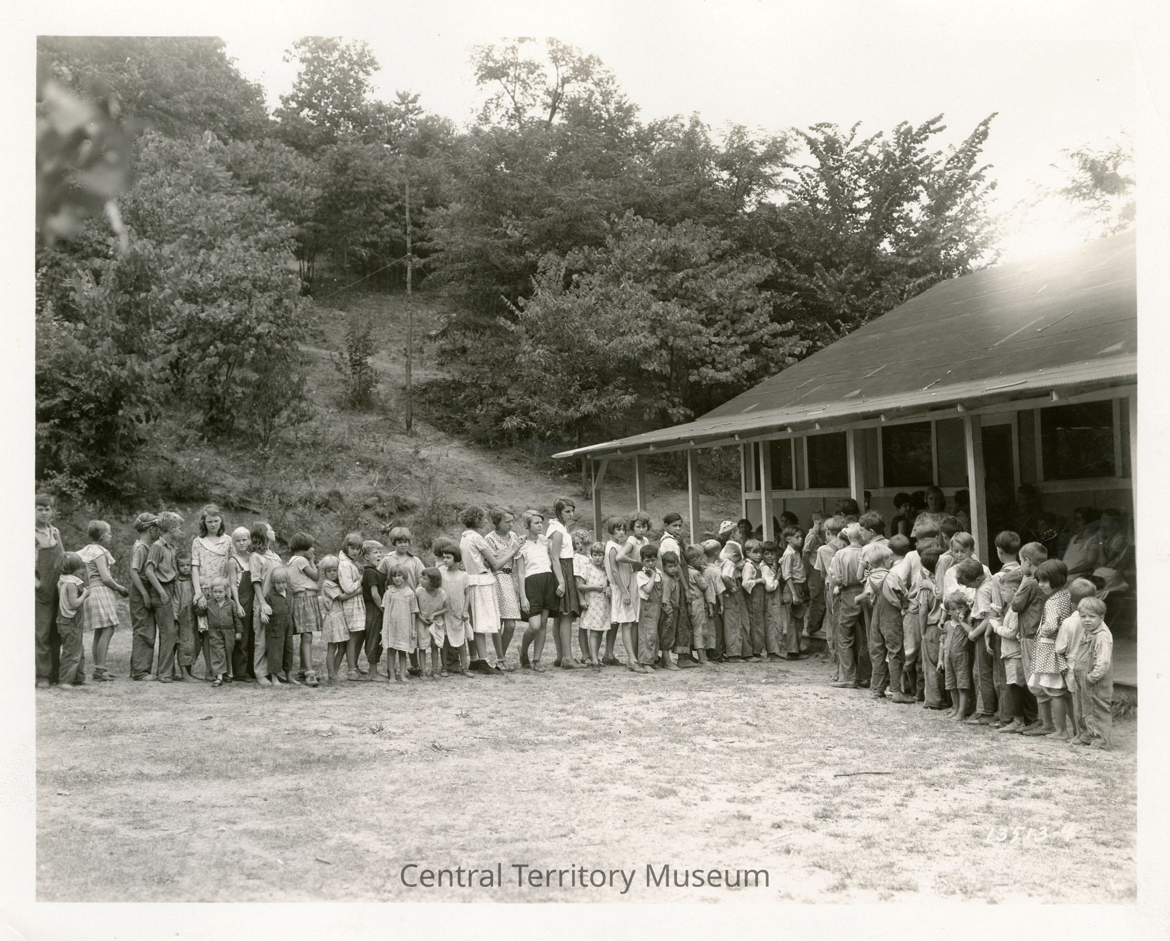 Photo taken during a summer camp session at Green Valley Camp near Peoria, Illinois. The image depicts a large group of boys and girls lined up in front of a camp building. A tree covered hill rises in the background.