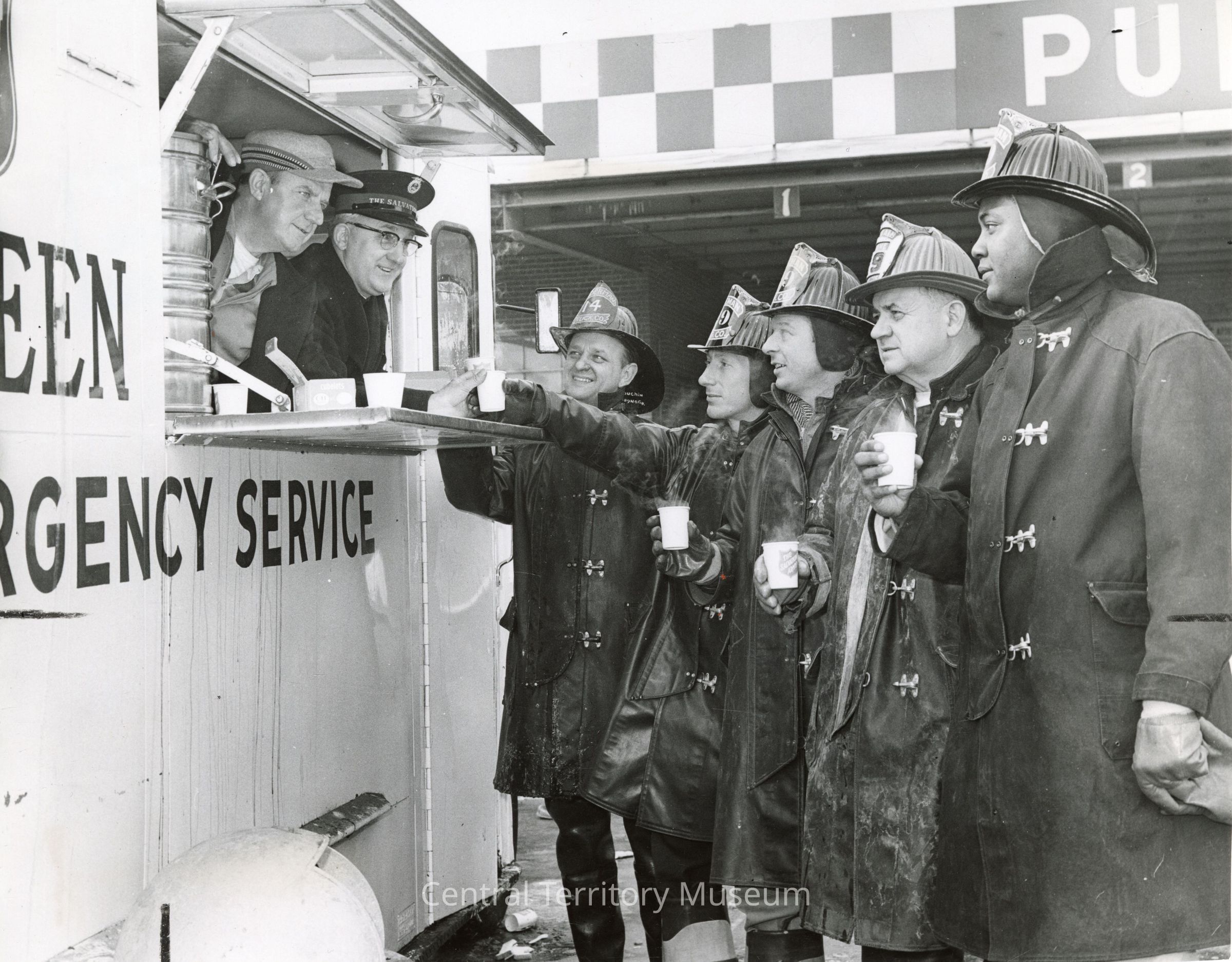 Photo of an Emergency Services canteen and volunteers serving coffee to a group of firefighters during the Ralston Purina plant fire and explosion.