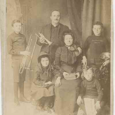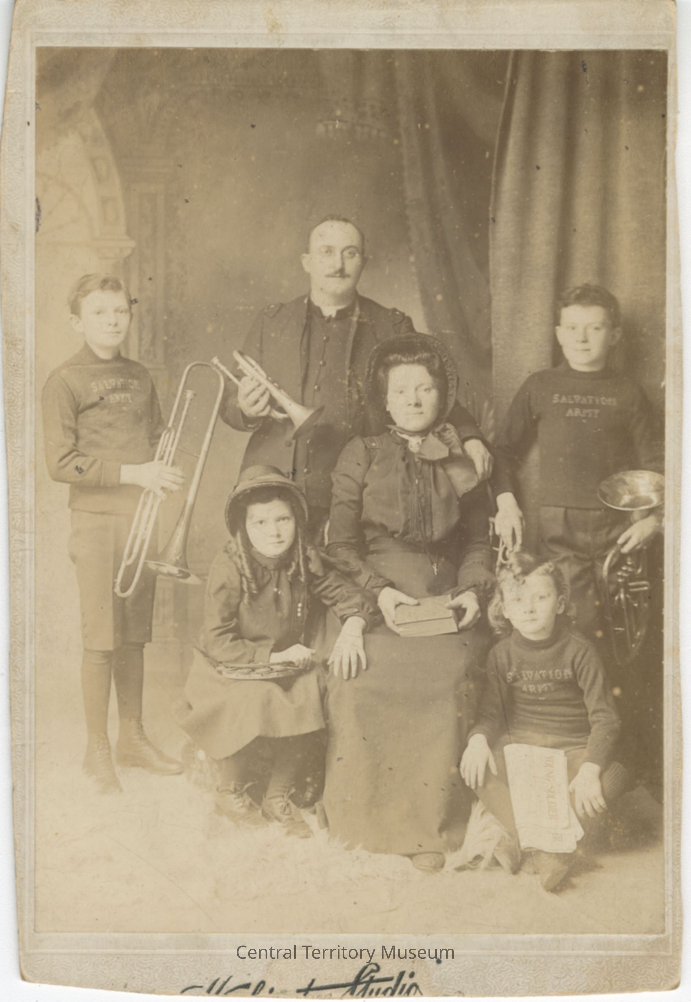 Photo, adhered onto hard paper mount, of the Joseph and Mary Sheppard family. The studio name has been cut off but was printed along the bottom edge of the photo. The image depicts Joseph Sheppard, in the center, with his two older sons, Joseph Stanley & John William, standing on either side. Mary Sheppard is seated in the front with her daughter Lucy on her right (photo left) and youngest son, Francis "Frank" on her left. Joseph is wearing his Salvation Army uniform and is holding a cornet. The boys, both wearing Salvation Army sweaters, are also holding brass horns. Lucy Sheppard is in a uniform and bonnet and is holding a tambourine in her lap. Mary, in her uniform and bonnet, is holding a book in her lap. Frank, wearing a Salvation Army sweater, is seated with a Young Soldier periodical in his lap. A studio backdrop forms the background.Acquisition
