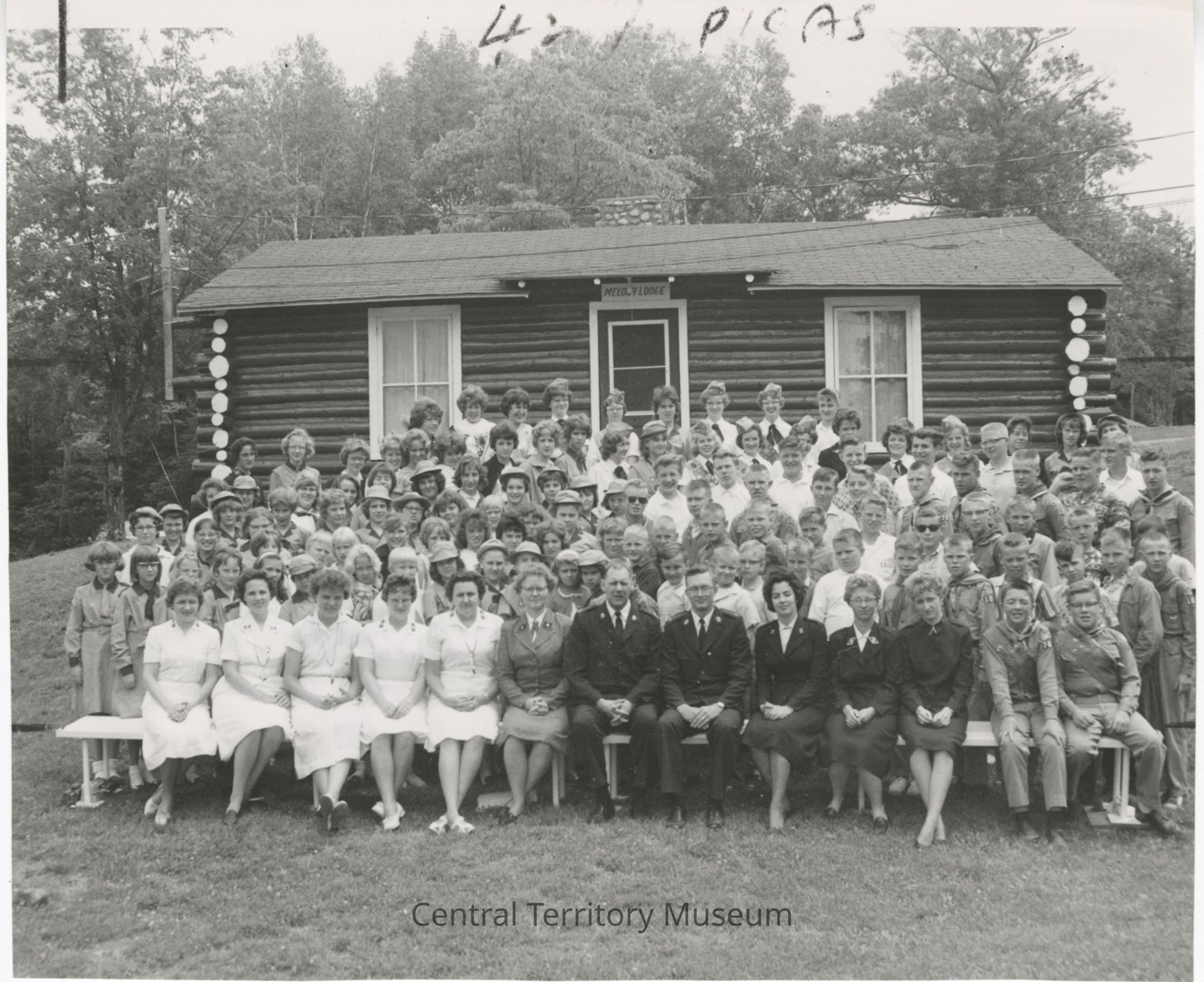 Photo of the Scandinavian Division Scout and Guard Camp at Hanging Horn Camp. The group of adults, boys, and girls are arranged in front of Melody Lodge, a log cabin building. The front row has women, wearing white uniforms and dark blue uniforms surrounding Major and Mrs. Alvin R. Nelson, who were in charge of the divisional youth section.Acquisition