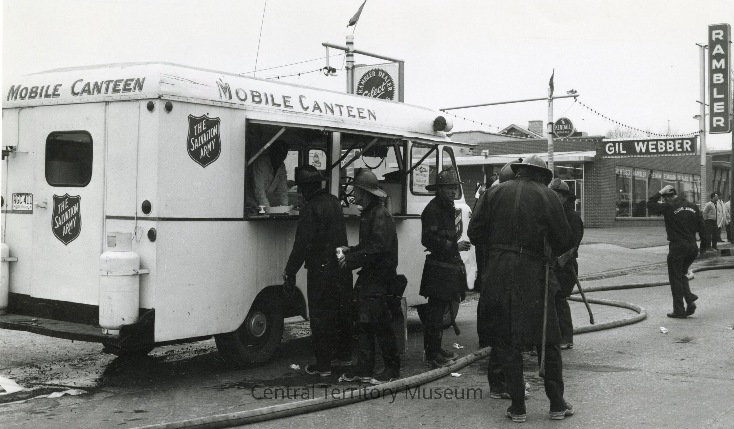 Photo of an Emergency Services canteen serving Kansas City firefighters. A volunteer is inside the canteen, handing out coffee and a box of doughnuts can be seen on the window shelf. Several of the firefighters are holding coffee cups. The business in the background is Gil Webber Rambler and a man, seen on the right side of the firemen, is wearing an Esquire Laundry uniform.