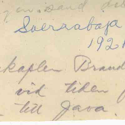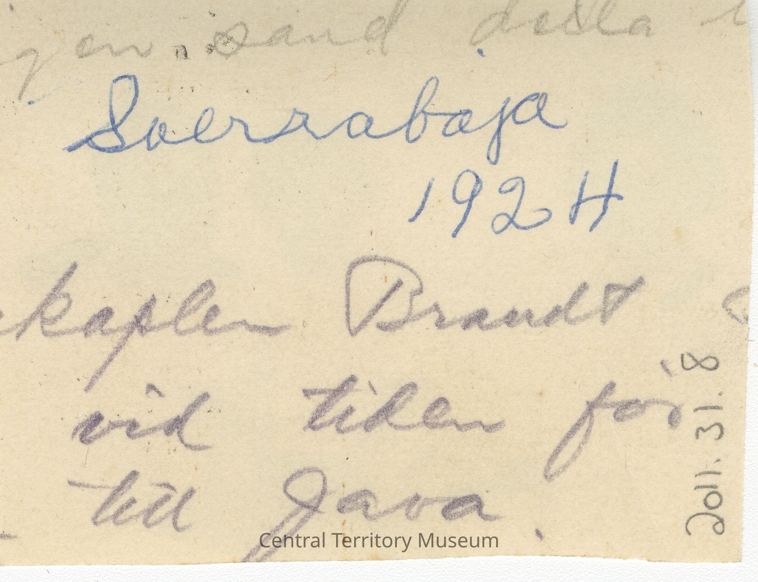 The back of the photo has the location Soerabaja 1924 handwritten in blue ink. Another note written below it is in Swedish and refers to the Brandts in Java. Both location names have changed so the location is Surabaya, the capital of the East Java Province in Indonesia.Acquisition