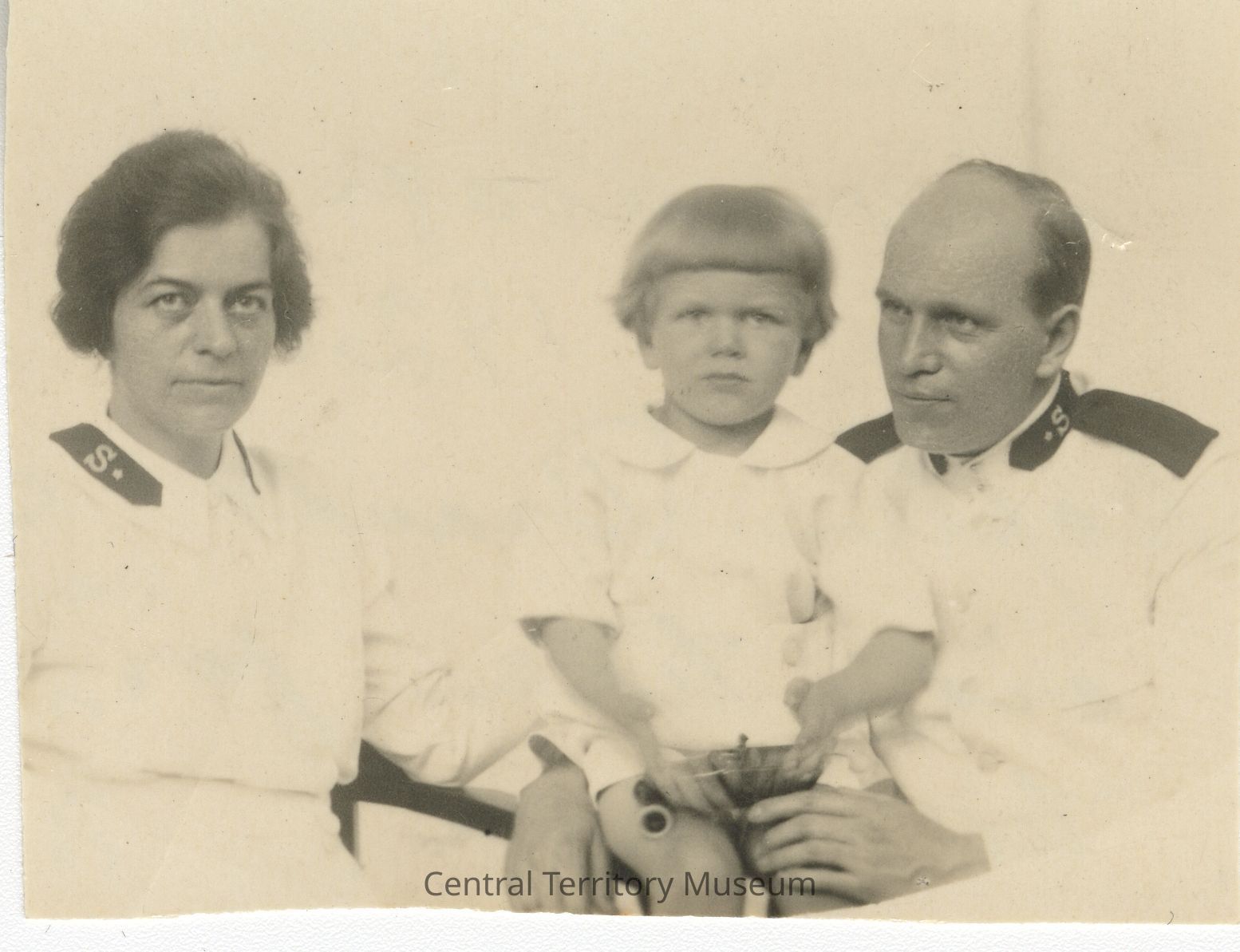 Photo of Ellen, Charles, and Ernst Brandt. Both Ellen and Ernst are wearing their white Salvation Army uniforms with dark epaulets and collar insignia. Charles Brandt is seated between his parents, wearing a white top and white shorts.