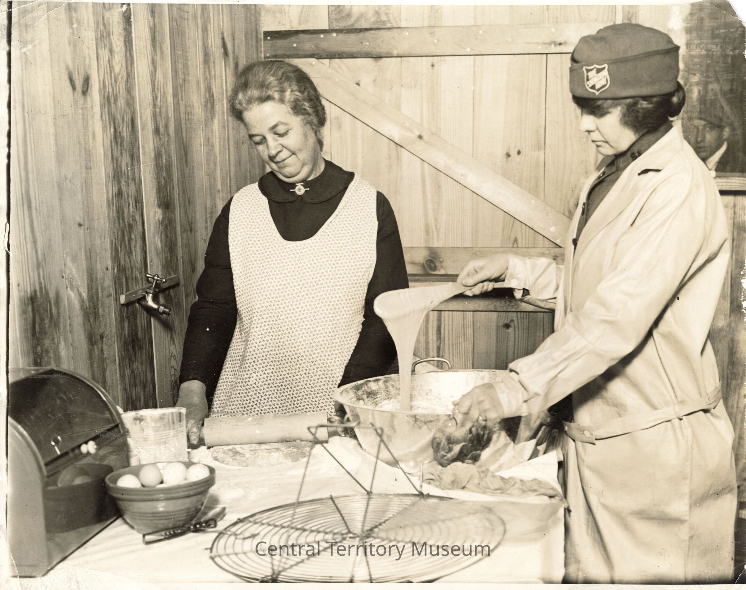 Photo of Isabella (Blomgren) Bonger stirring batter and Mary (Casley) Sheppard rolling dough inside a replica World War 1 Salvation Army hutment in Detroit, MI. The women, both World War I Doughnut Girls, were helping fundraise for a joint building campaign between The Salvation Army, Detroit's Grace Hospital, and the Narcotic Educational Association held in May 1929. The hut was set up on Washington Boulevard between State Street and Grand River Avenue.Acquisition