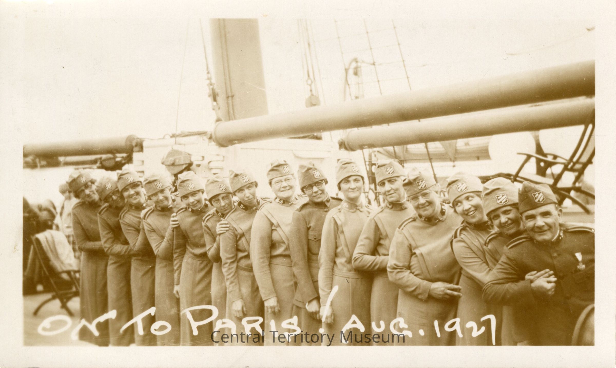 Photo of the Salvation Army officers on board the ship to Paris, France, heading to the American Legion convention. A caption, printed in white on the bottom edge, reads "On To Paris Aug 1927". A man is in the front (far right) with a line of Doughnut Girls stretching behind him. Ship riggining can be seen in the background.Acquisition