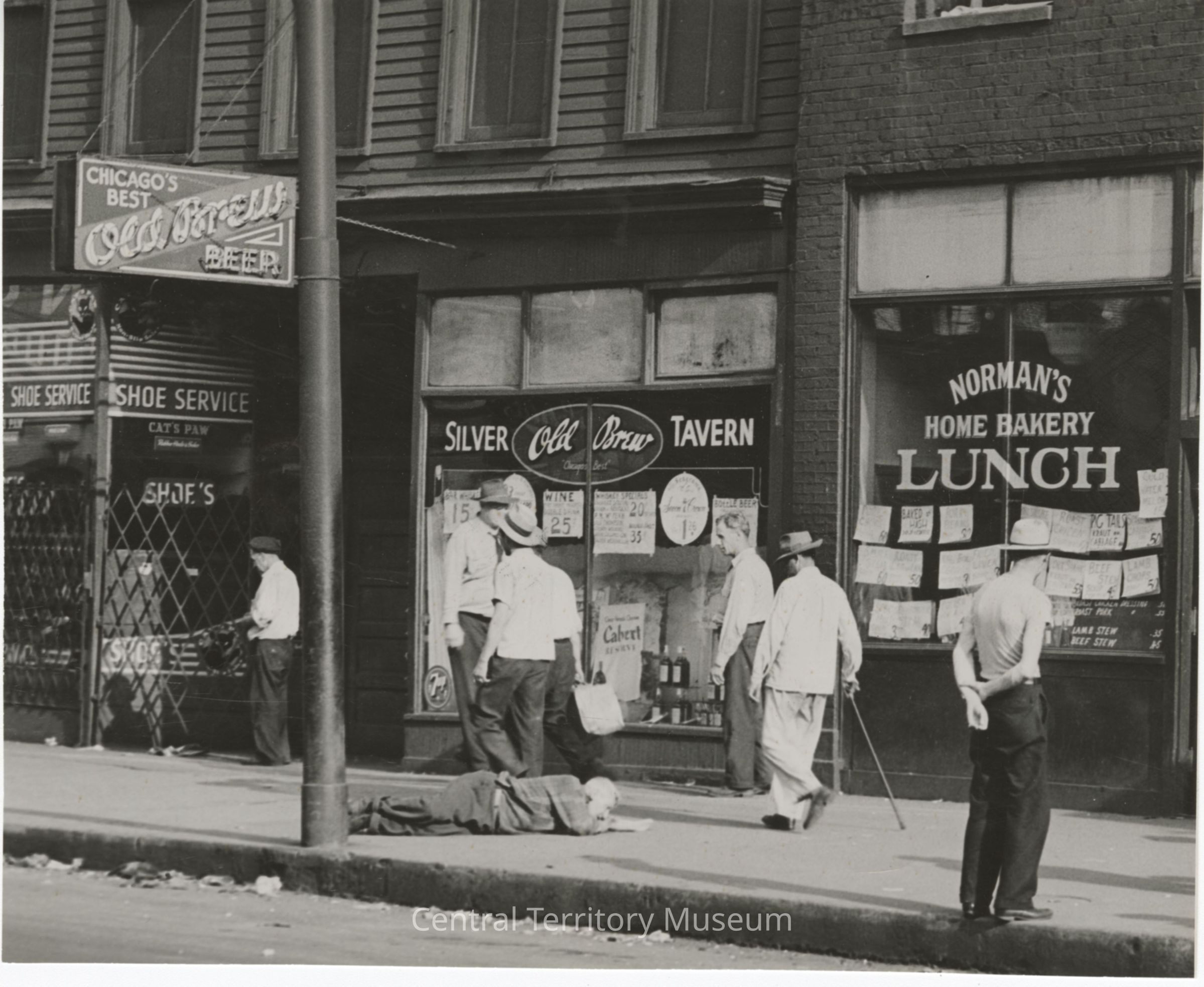 Photo of men walking on the sidewalk on West Madison Street in Chicago, Illinois. One man is passed out, lying on the sidewalk, in front of the Silver Tavern. A shoe store, with a metal security grate around the front, is next to the tavern and Norman's Home Bakery, a restaurant, is on the right of the bar.Acquisition