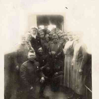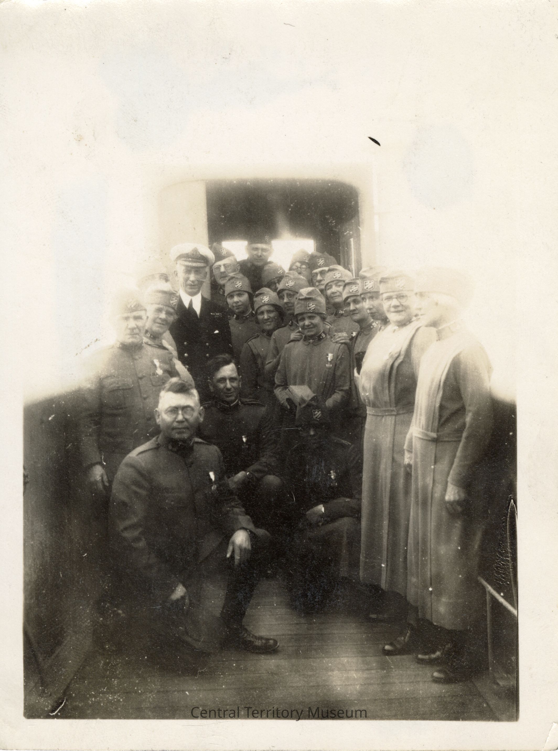 Photo of a group of men and women Salvation Army officers with the ship captain, traveling to Paris, France for the 1927 American Legion convention. They are wearing their World War I Salvation Army uniforms, noting their service as Doughnut Girls and Doughnut Guys. Many of them are wearing a medal pinned to their left chest. Mary "Ma" (Casley) Sheppard is standing second from the right.Acquisition