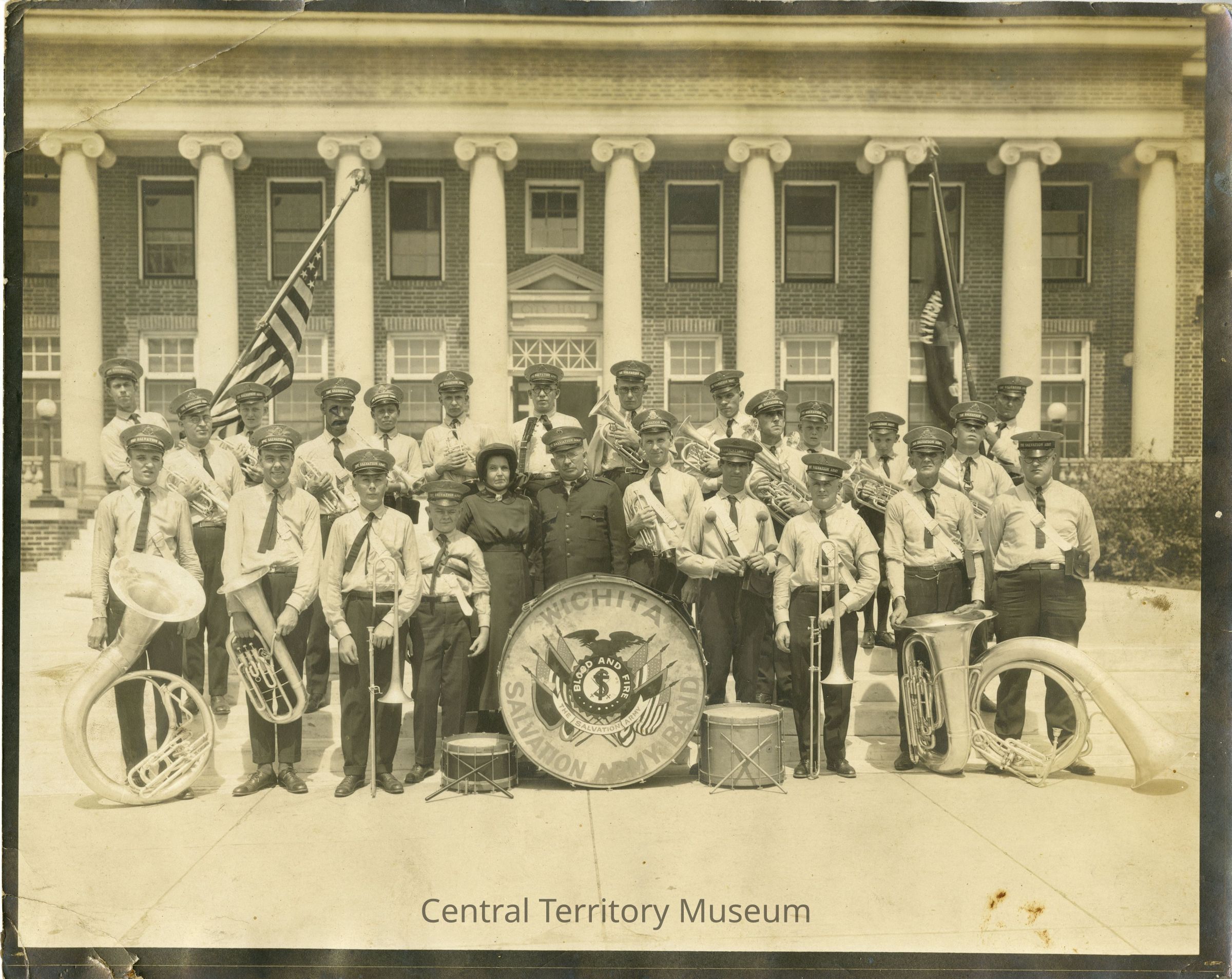 Photo of the Wichita (Citadel), KS Corps Band, taken outside of the Arkansas City, KS City Hall. The men and boys are holding their brass instruments and two men, in the back row, are the flagbearers with the American flag on the left and The Salvation Army flag on the right. The corps' large bass drum is in the center with smaller drums on either side. The corps officers are standing behind the bass drum.Acquisition