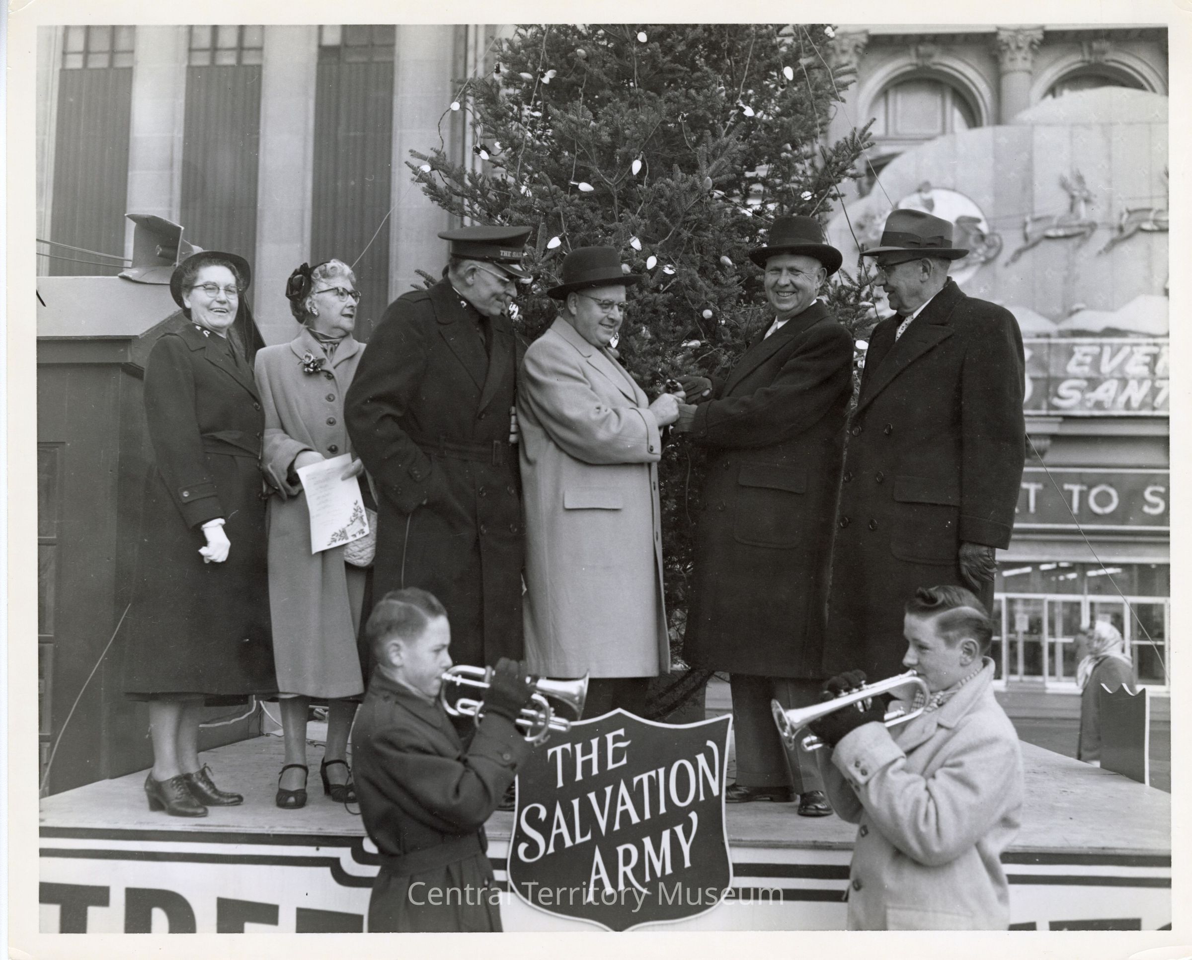 Photo of people posing on the platform around the Tree of Lights in Detroit, Michigan. Divisional Commander J. Clyde Cox is third from left and his wife, Opal Cox, is the first woman on the left. Two young boys, with cornets to their mouths, are in front of the group.
