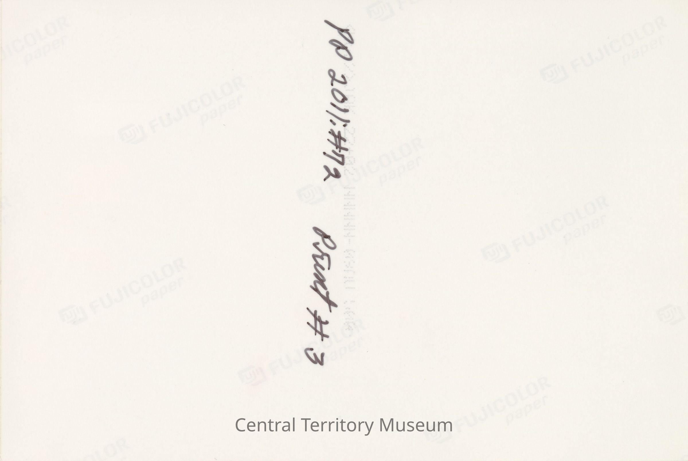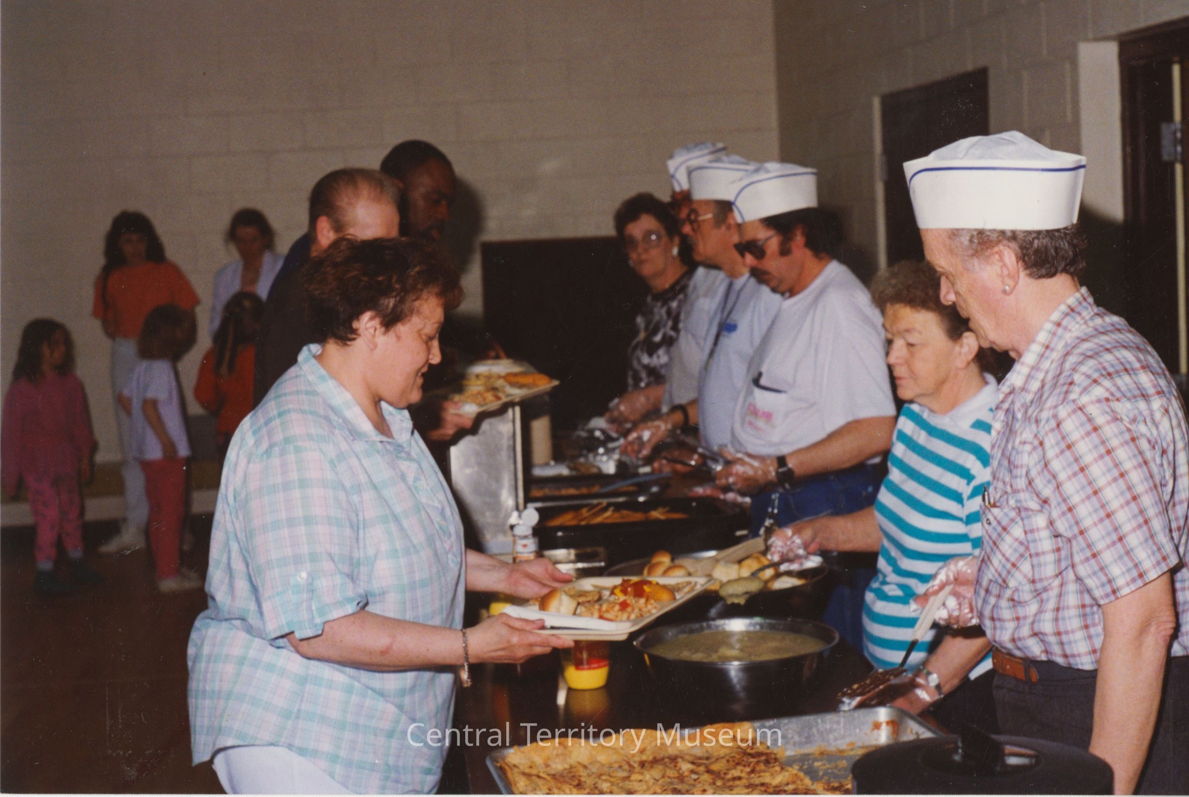Color photograph showing an woman wearing a blue plaid blouse going through a buffet line. Men and women wearing white paper hats serve the food.