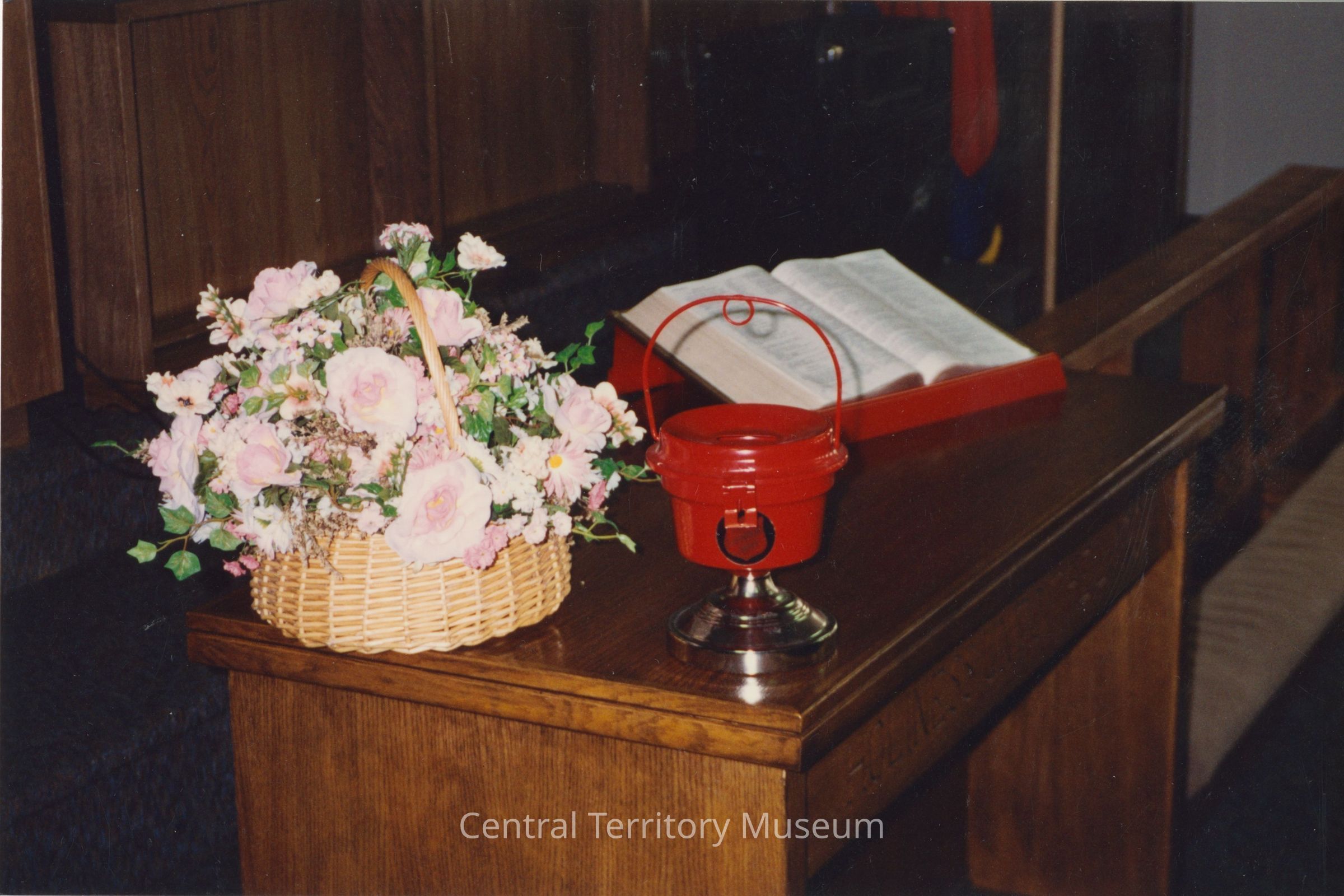 Color photograph showing a brown wood altar table with a large pink artificial floral arrangement in a wicker basket, a tabletop Red Kettle donation bank, and an open Bible on a red metal stand. A portion of a Salvation Army flag can be seen in the background. Janesville, Wisconsin