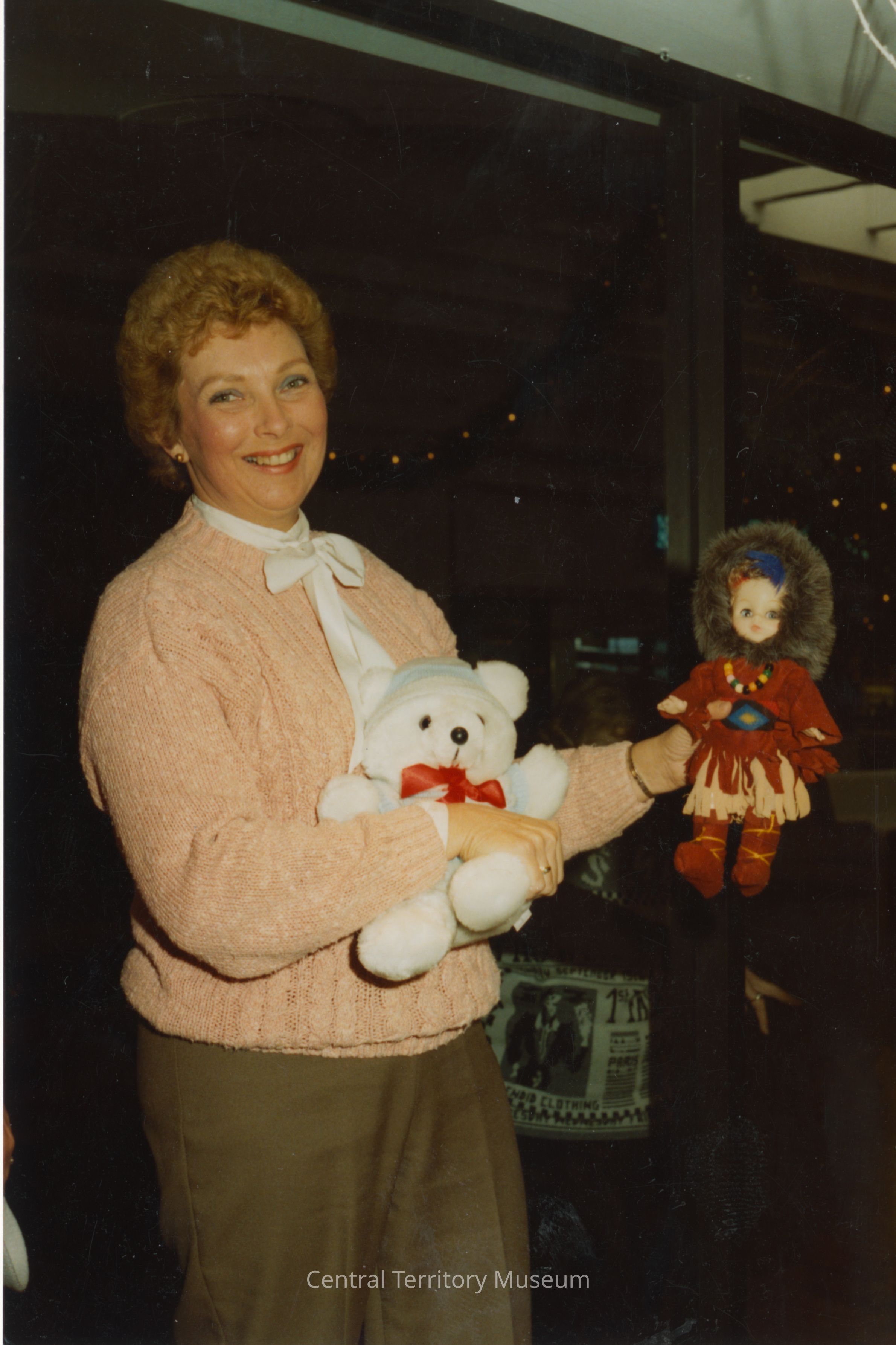 Color photograph showing a woman with short blonde hair, wearing a pink sweater, white tie neck blouse, and brown pants. She holds a doll and Teddy Bear. Her Dress-a-Doll contest entry depicts an Eskimo and her Dress-a-Teddy Bear contest entry has a knit cap and outfit with red bow tie. The Dress-a-Doll and Dress-a-Teddy Bear contests were fundraisiers for the corps. The toys were later donated to children in the community.