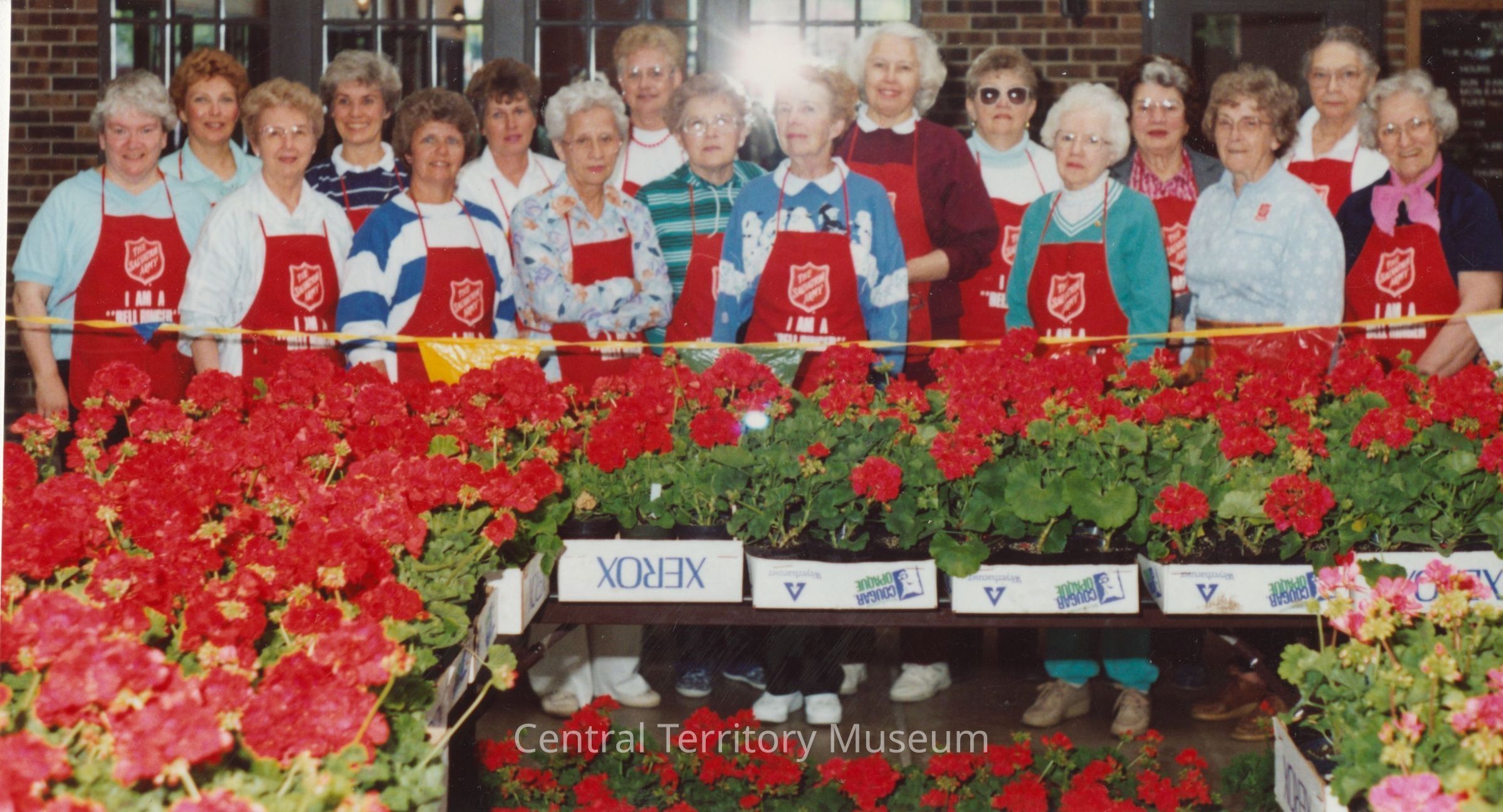 Color photograph showing a view of the Janesville Women's Auxiliary Plant Sale in which auxiliary members wearing red aprons stand behind tables filled with red geranium plants.
