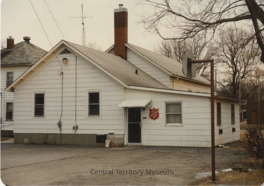 Photo of the corps building in Lincoln, Illinois. The frame building has white siding, a low pitched roof with two elevations and a flat roofed addition on the right. A Salvation Army Red Shield is affixed to the wall next to the entry door. A basketball hoop can be seen in the foreground on the right.