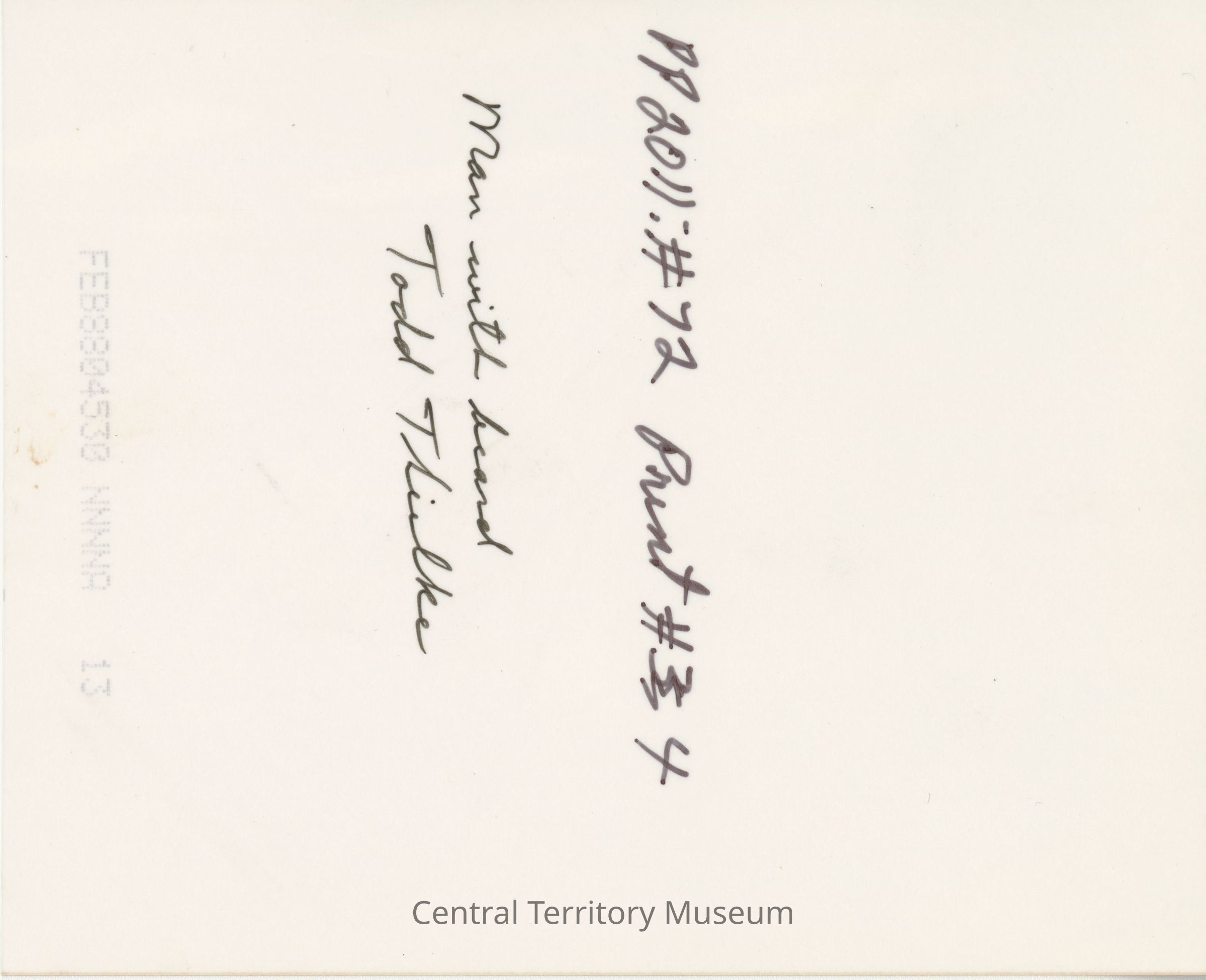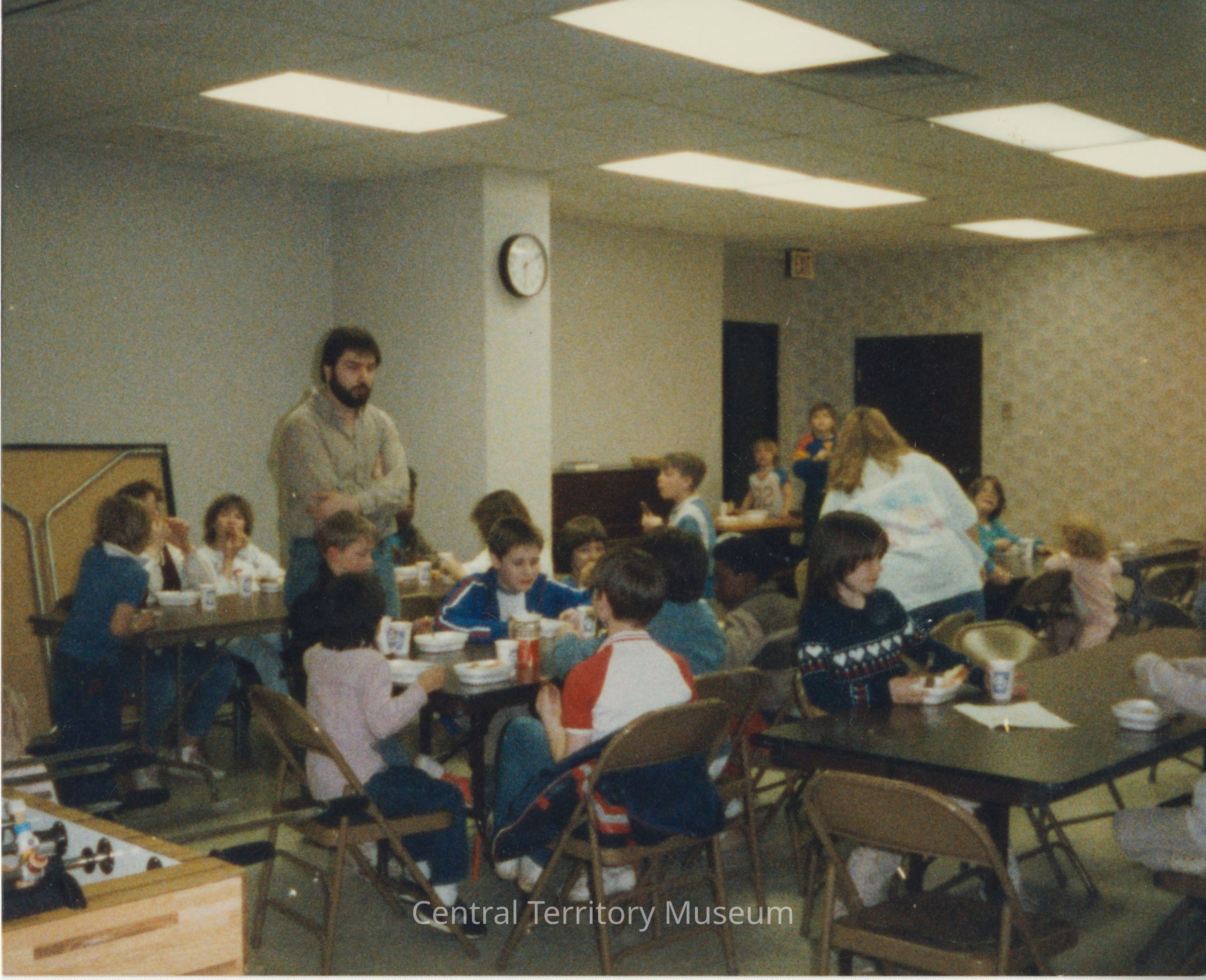 Color photograph showing Todd Thielke (man with beard) standing as children eat a meal at folding tables.