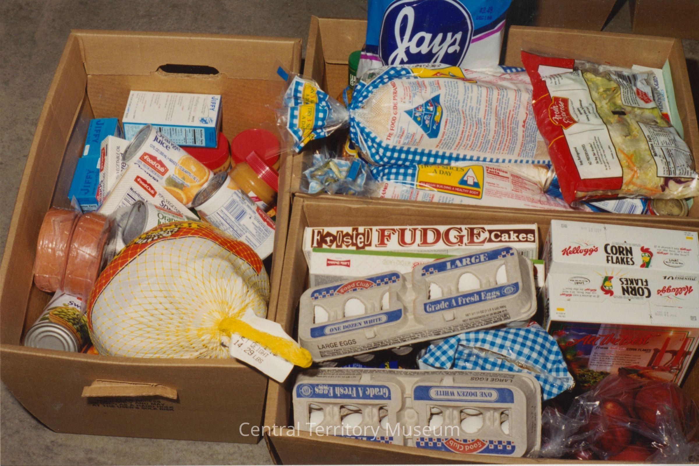 Color photograph showing the contents of a Christmas food box for a family. The box (really three separate boxes) contains groceries including a turkey, cereal, bread, salad, and other grocery items.