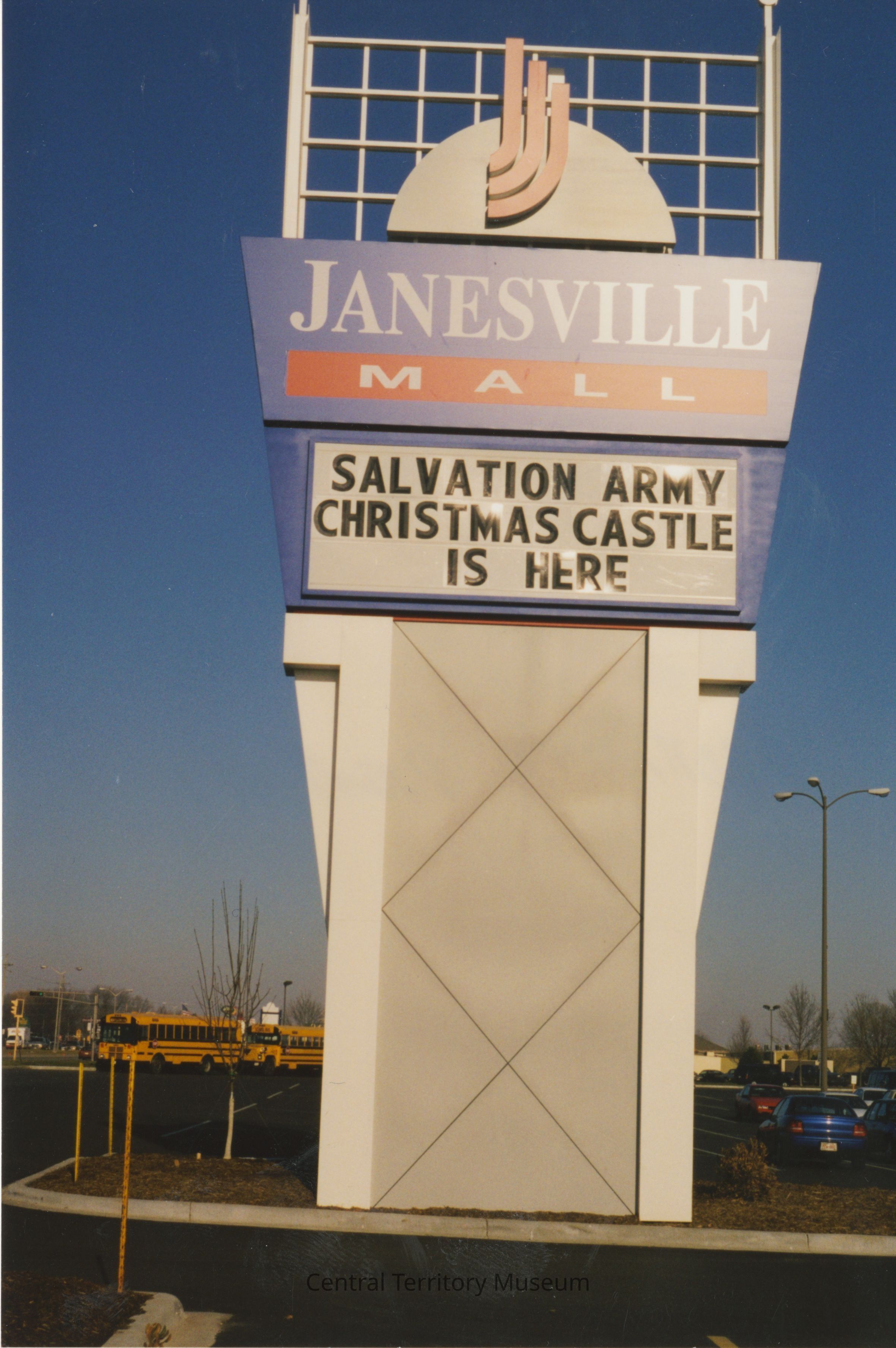 Color photograph showing the Janesville Mall sign with additional text promoting corps event. Text reads: "Salvation Army Christmas Castle is Here."