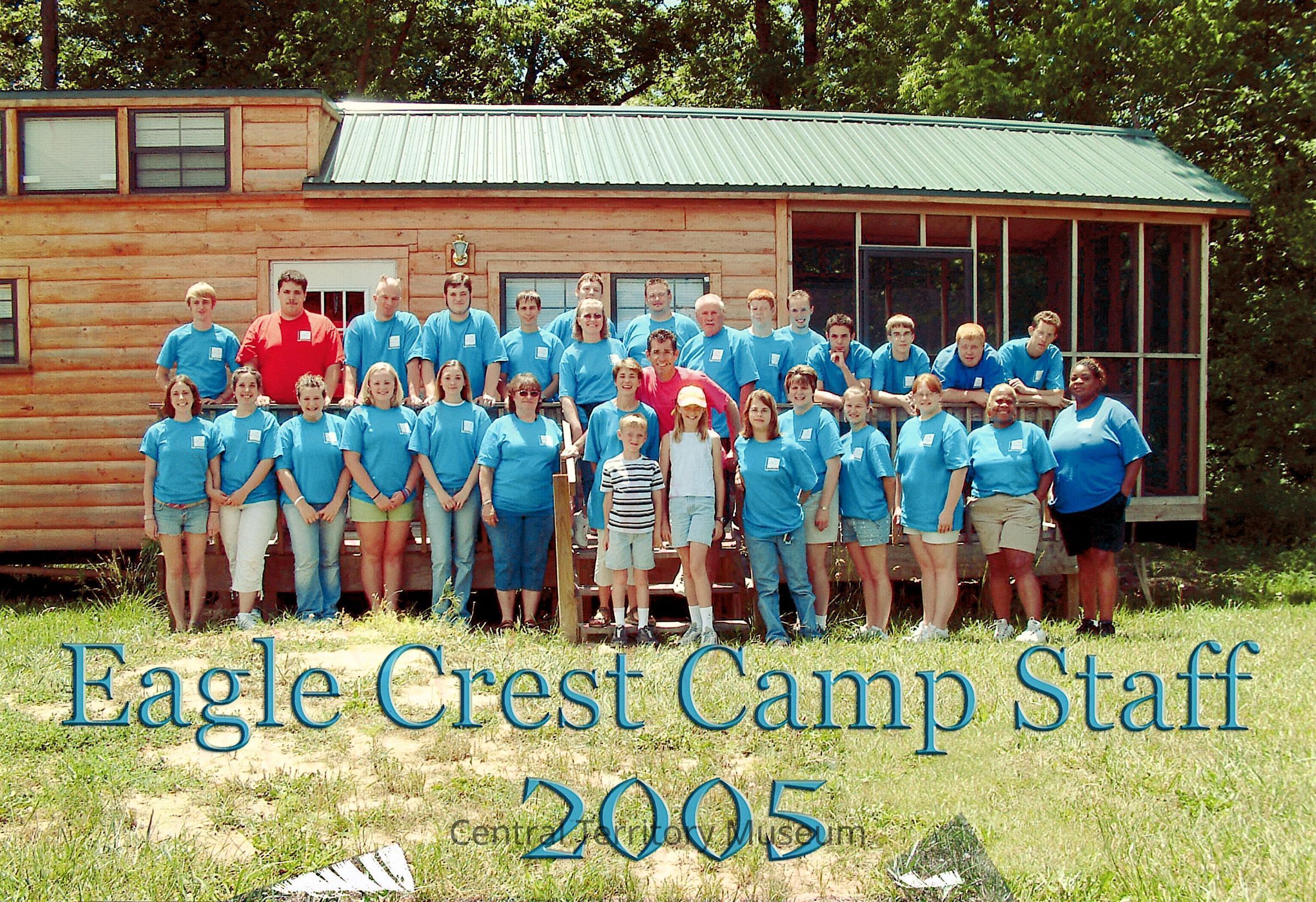 Color photo of the Eagle Crest Camp staff in 2005. The group of young men and young women are arranged in two rows in front of a cabin, all wearing medium blue shirts. A man and a woman in the center of the first row have a boy and girl standing in front of them. The title "Eagle Crest Camp Staff 2005" is printed in medium blue along the bottom edge of the photo. A white border is on the top edge of the image.