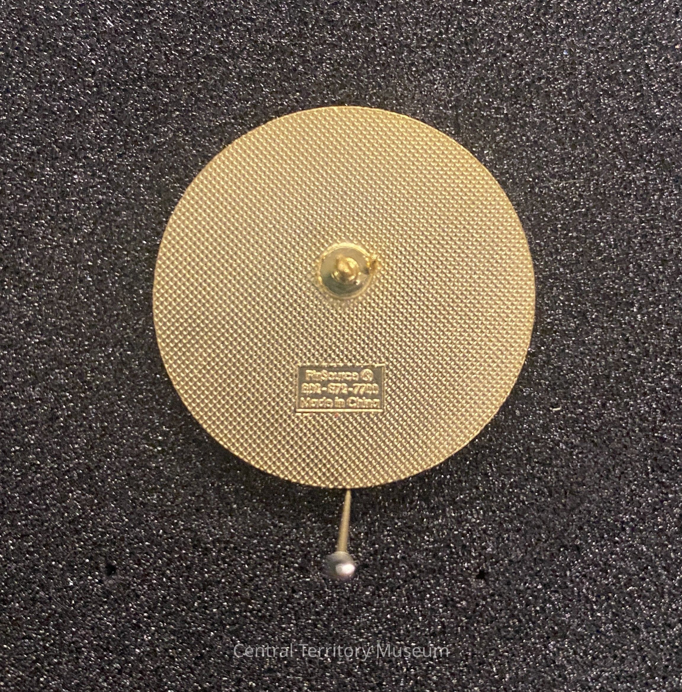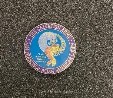 Circular metal and enamel pin. The outer ring, with a dark blue background, has the following text inscribed in gold: The Salvation Army / San Francisco Asian American Corps. The center of the pin has a dark teal background with a gold / yellow / orange koi fish in front of a stylized gold wave and text: "I will make you fishers of men" inscribed to the left of the fish.