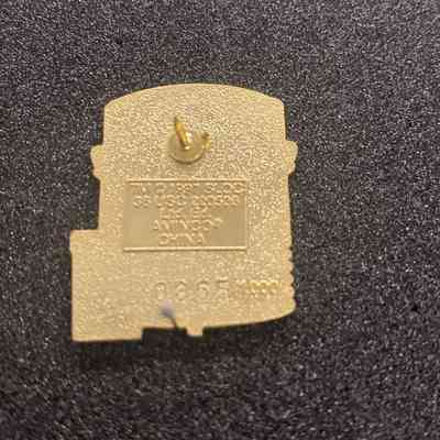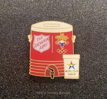 Metal and enamel pin, shaped to look like a five gallon thermal container with a disposable coffee cup on its right side. A Salvation Army Red Shield logo is printed on the upper left side of the container and the 2002 Salt Lake Winter Olympics logo is printed on the right. A black tap dispenser is in the center of the lower edge of the container. The coffee cup has the More Than Gold 2002 star logo printed on it.