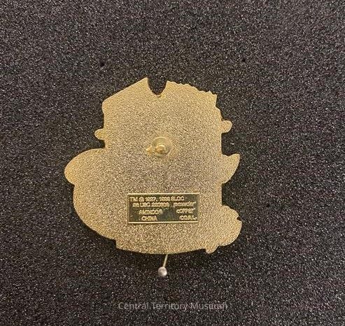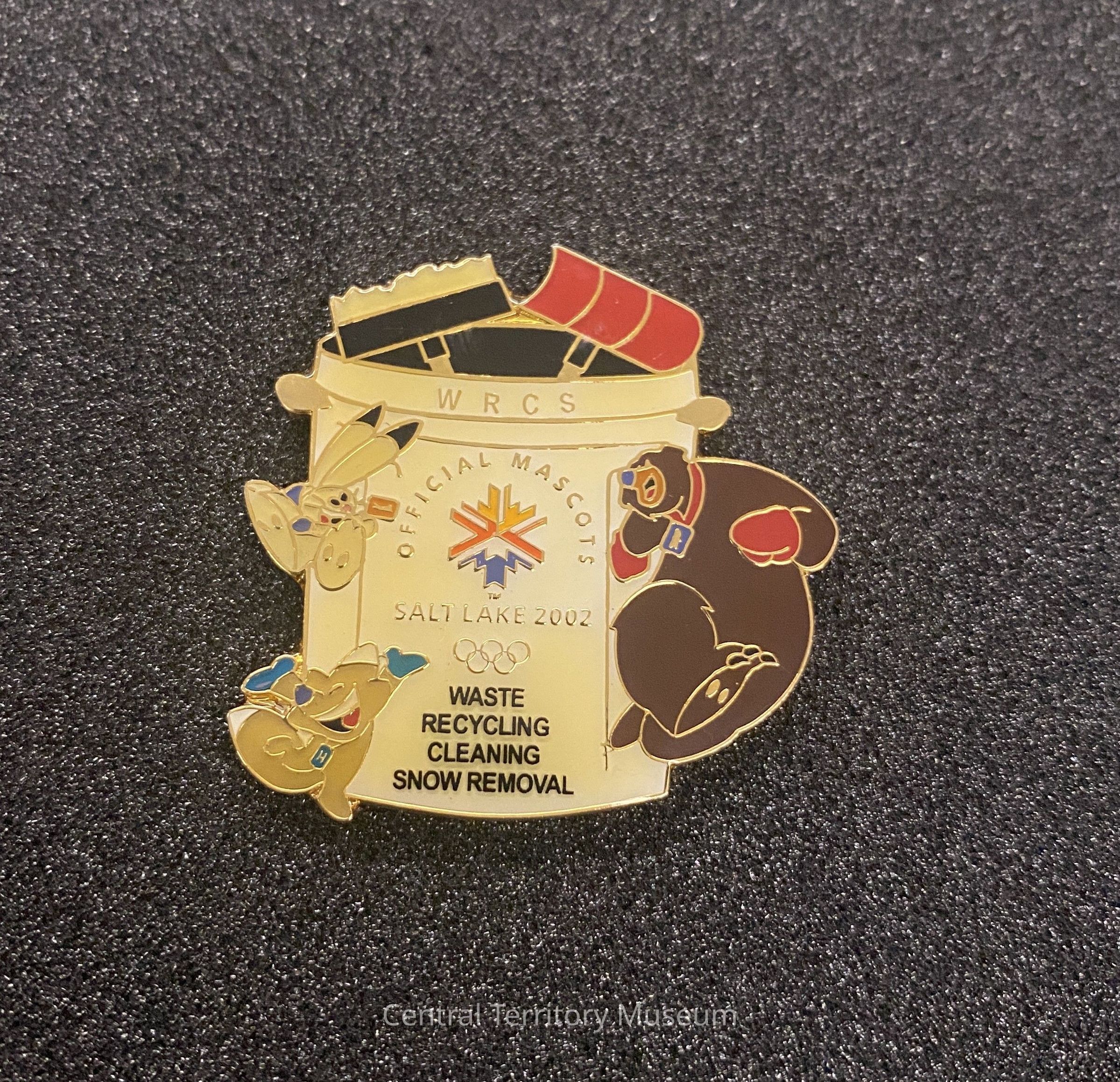 Metal and enamel pin created for the 2002 Winter Olympics in Salt Lake City, Utah. The pin is shaped like a trash can with a broom and a snow shovel inside. Three animals - a snowshoe hare, a coyote, and a black bear flank the can and represent the official mascots [Powder, Copper, & Coal] of the games. The initials WRCS are inscribed just below the opening of the can. Below that, the Salt Lake 2002 logo and the Olympic rings are inscribed followed by this text in black: WASTE / RECYCLING / CLEANING / SNOW REMOVAL.