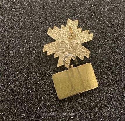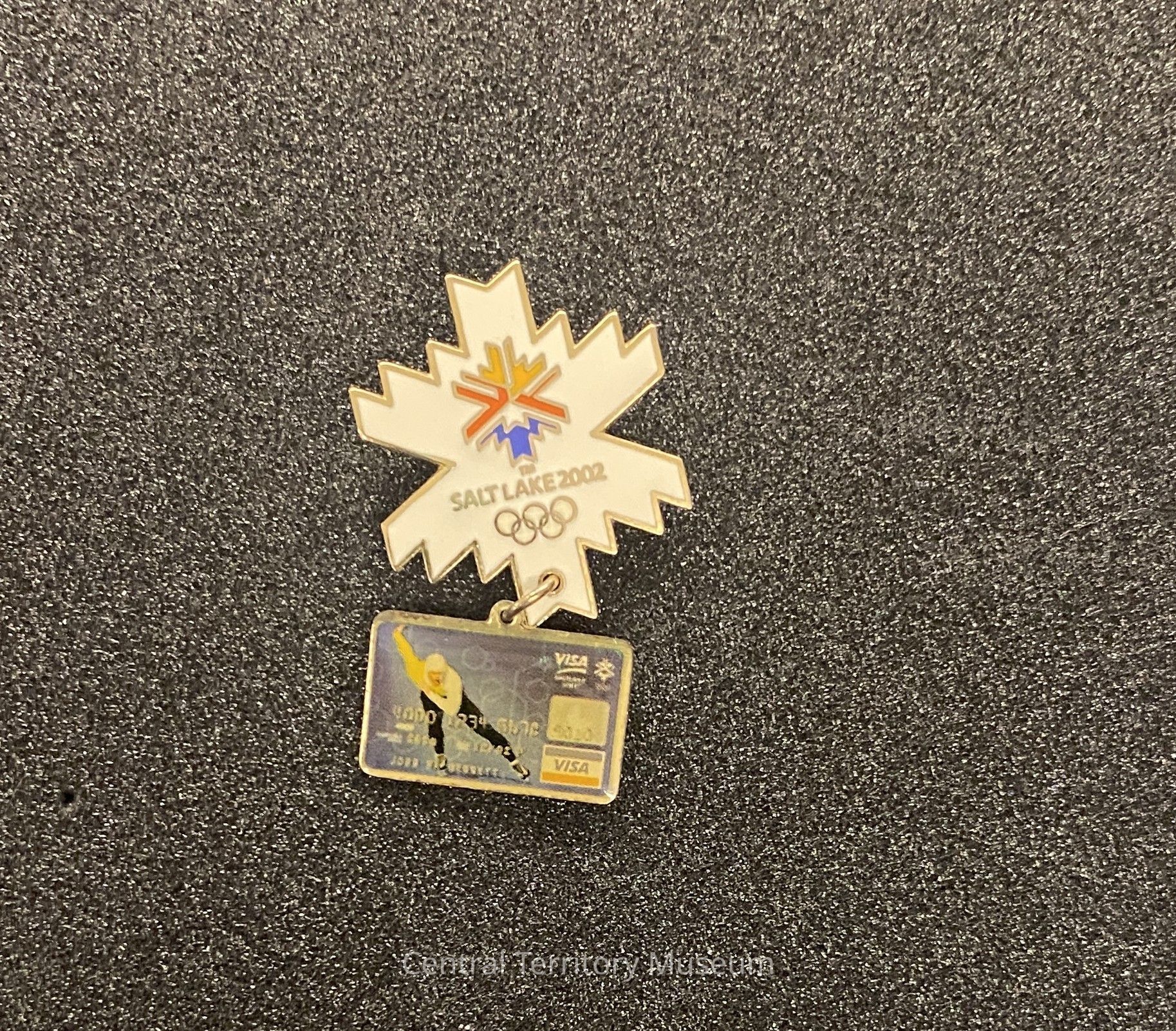 Metal and enamel pin, created for the 2002 Winter Olympics in Salt Lake City, Utah. The pin is shaped like a stylized white snowflake with the Salt Lake 2002 logo printed in the center and the five interlocked Olympic rings below. A smaller metal and enamel element dangles from the bottom of the snowflake via a jump ring. That element is designed to look like a Visa card with a speed skater as its image.
