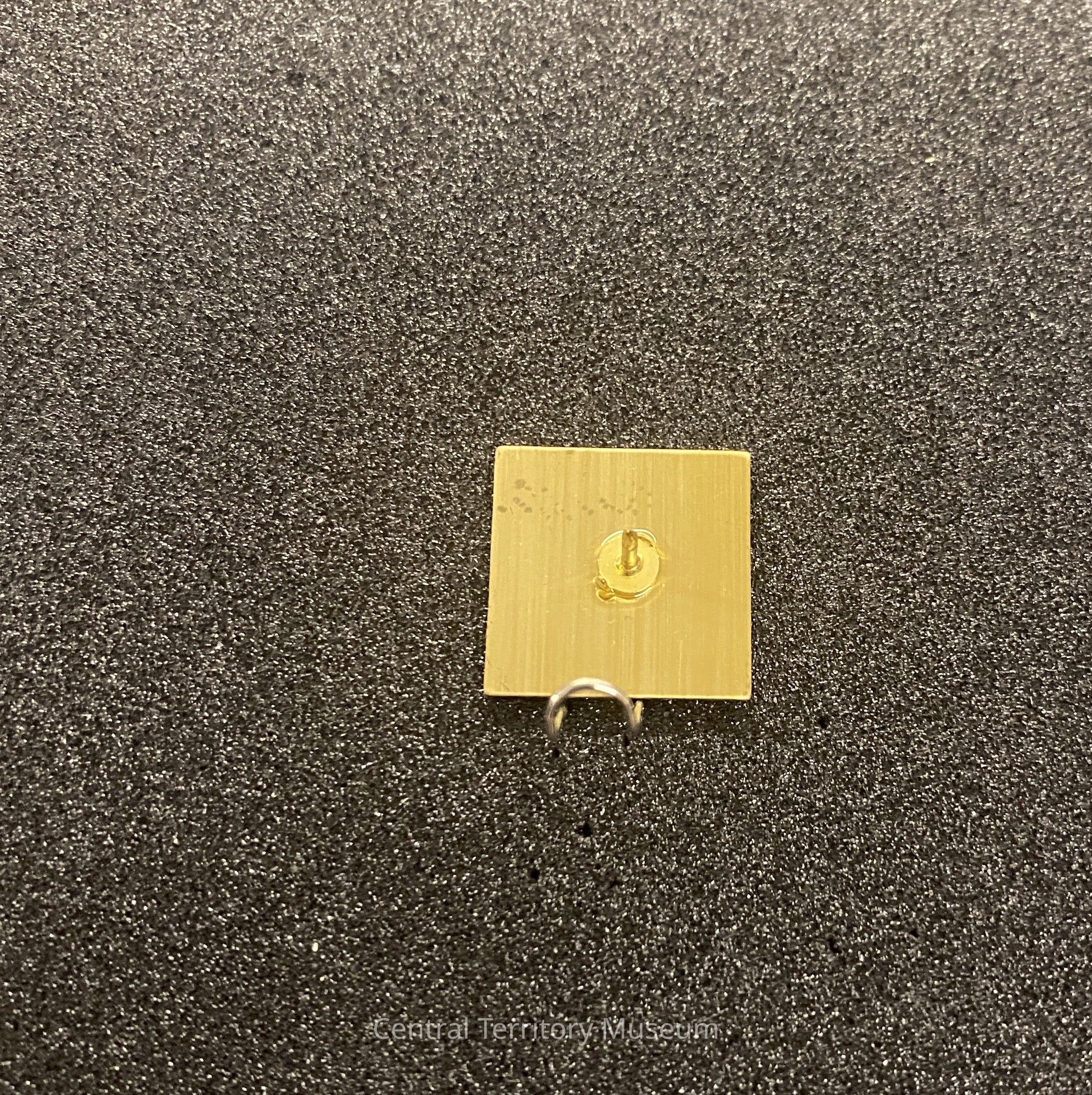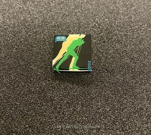 Metal and enamel pin, created for the 2002 Winter Olympics held in Salt Lake City, Utah. The square pin has a black background with silhouettes of two Nordic (cross-country) skiers, one in cream and the other in green. The company, Salomon, has its logo in the upper left corner and the year 2002 is in the lower right corner, both inscribed in a dusty blue.