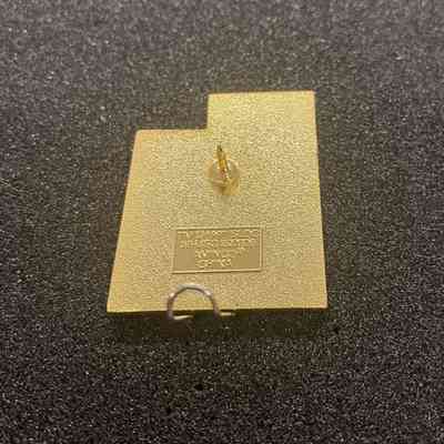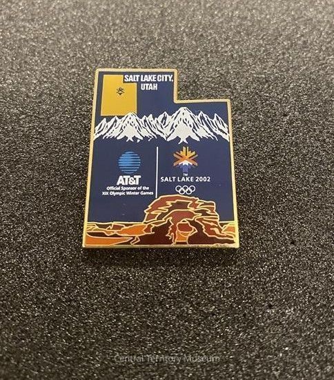 Metal and enamel pin, created for the 2002 Winter Olympics held at Salt Lake City, Utah. The pin is shaped as the state of Utah with a gold outlined edge and a dark blue background. The mountains are highlighted in white near the top edge. A yellow graphic with a mark for Salt Lake City is in the upper left corner. The logo for AT&T is below the mountains on the left and the Salt Lake 2002 logo is on the right. A copper and brown graphic along the lower edge commemorates the desert landscape of the state.