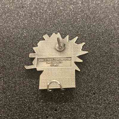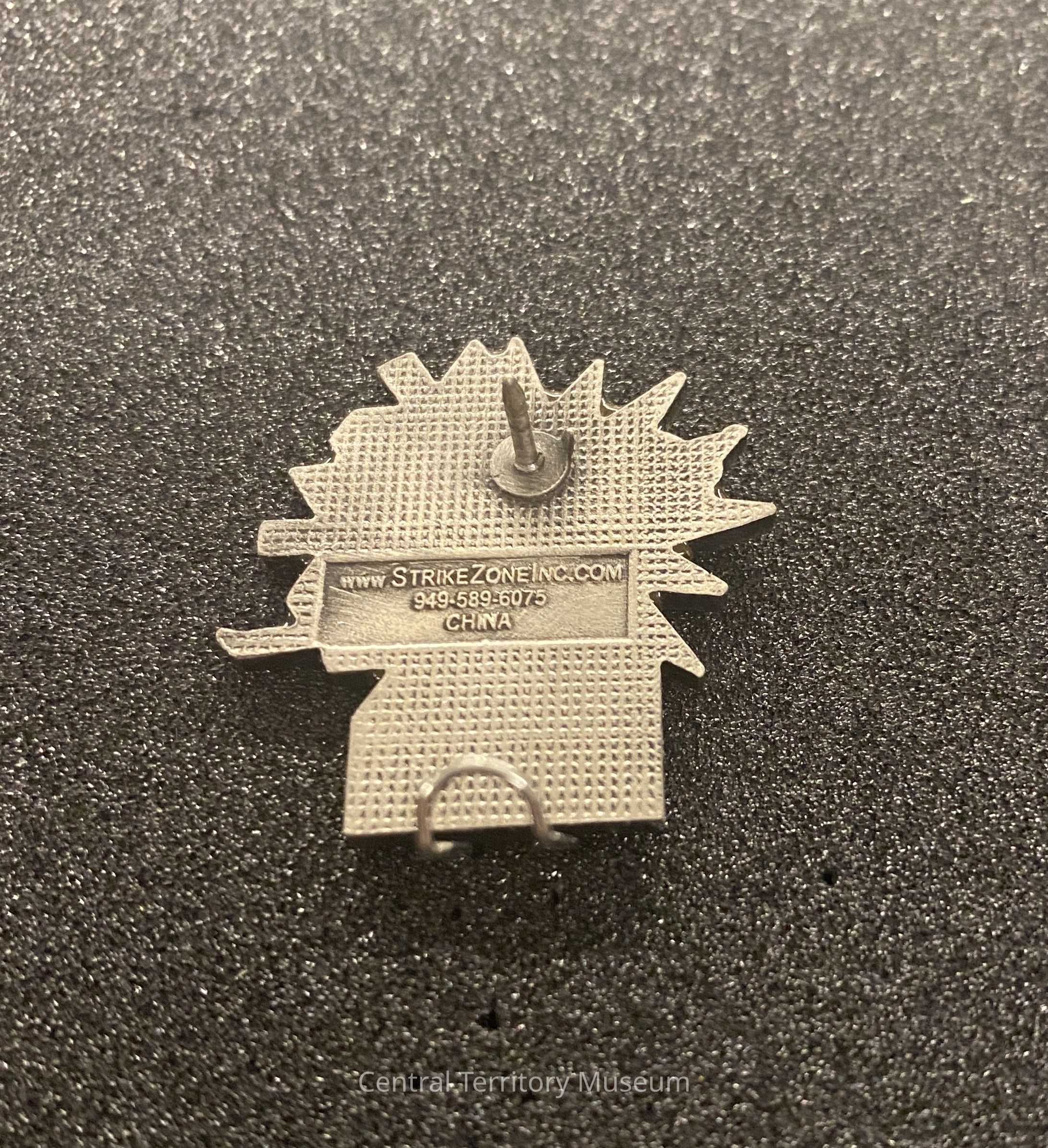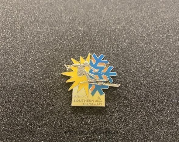 Metal and enamel pin, created for the 2002 Winter Olympics held at Salt Lake City, Utah. The pin has a shaped top and a square bottom, featuring a silver downhiller skier in action against a stylized snowflake backdrop. The snowflake is created in the official Salt Lake 2002 colors of yellow, blue and orange. The logo for Southern Company is inscribed on a white background below the skier.
