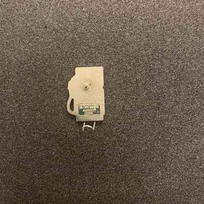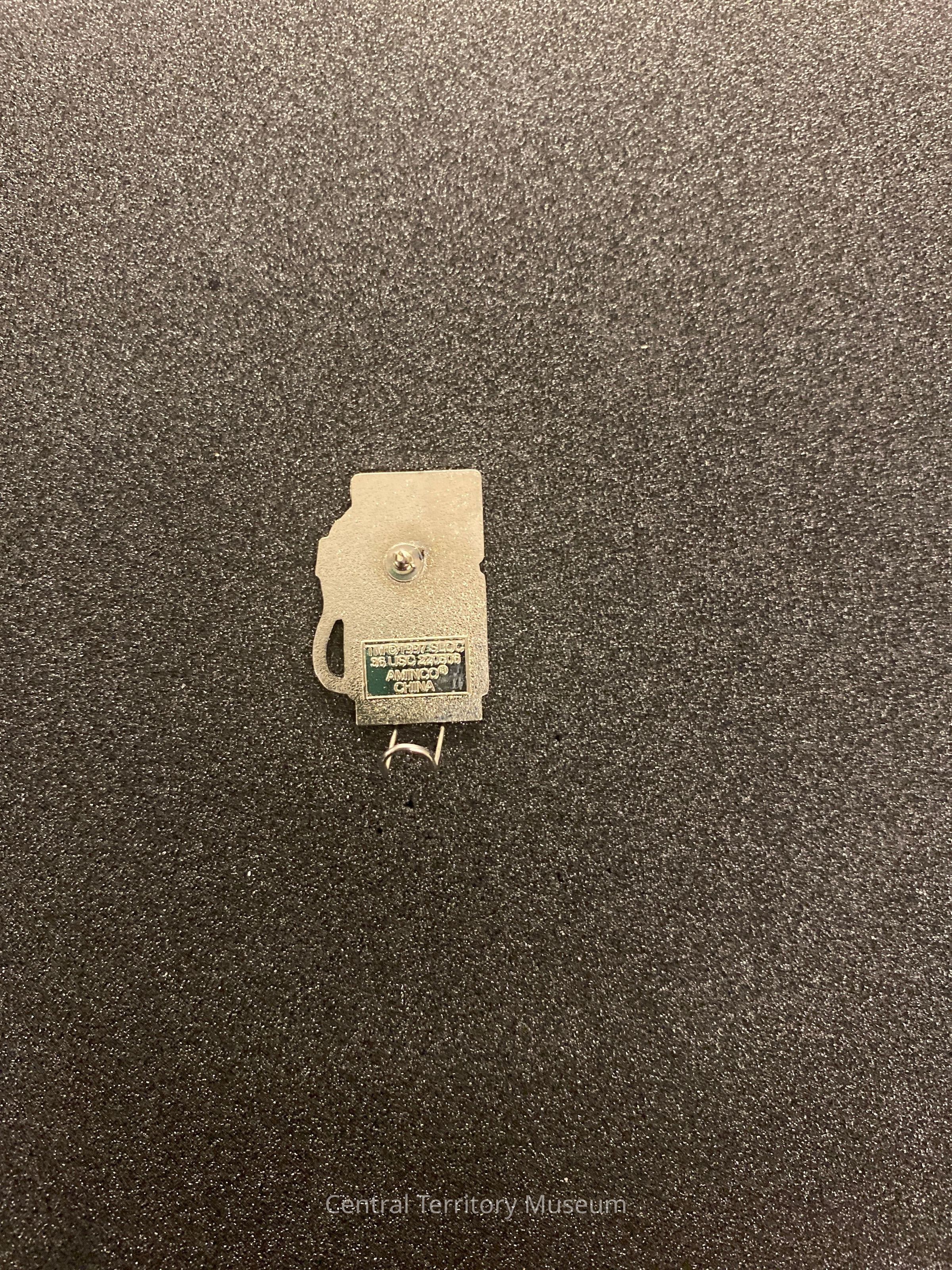 Metal and enamel pin, created for the 2002 Winter Olympics held at Salt Lake City, Utah. The pin is shaped like a gas pump, with the Chevron logo on a blue background in the upper left. Next to the Chevron logo is a silver square with Feb 2002 inscribed instead of the price and gallons. A blue pump handle and black hose are on the right side of the pin. The body of the pump has a black background with the Salt Lake 2002 logo inscribed in the center. Silver graphic design elements in each corner are reminiscent of Native American design.