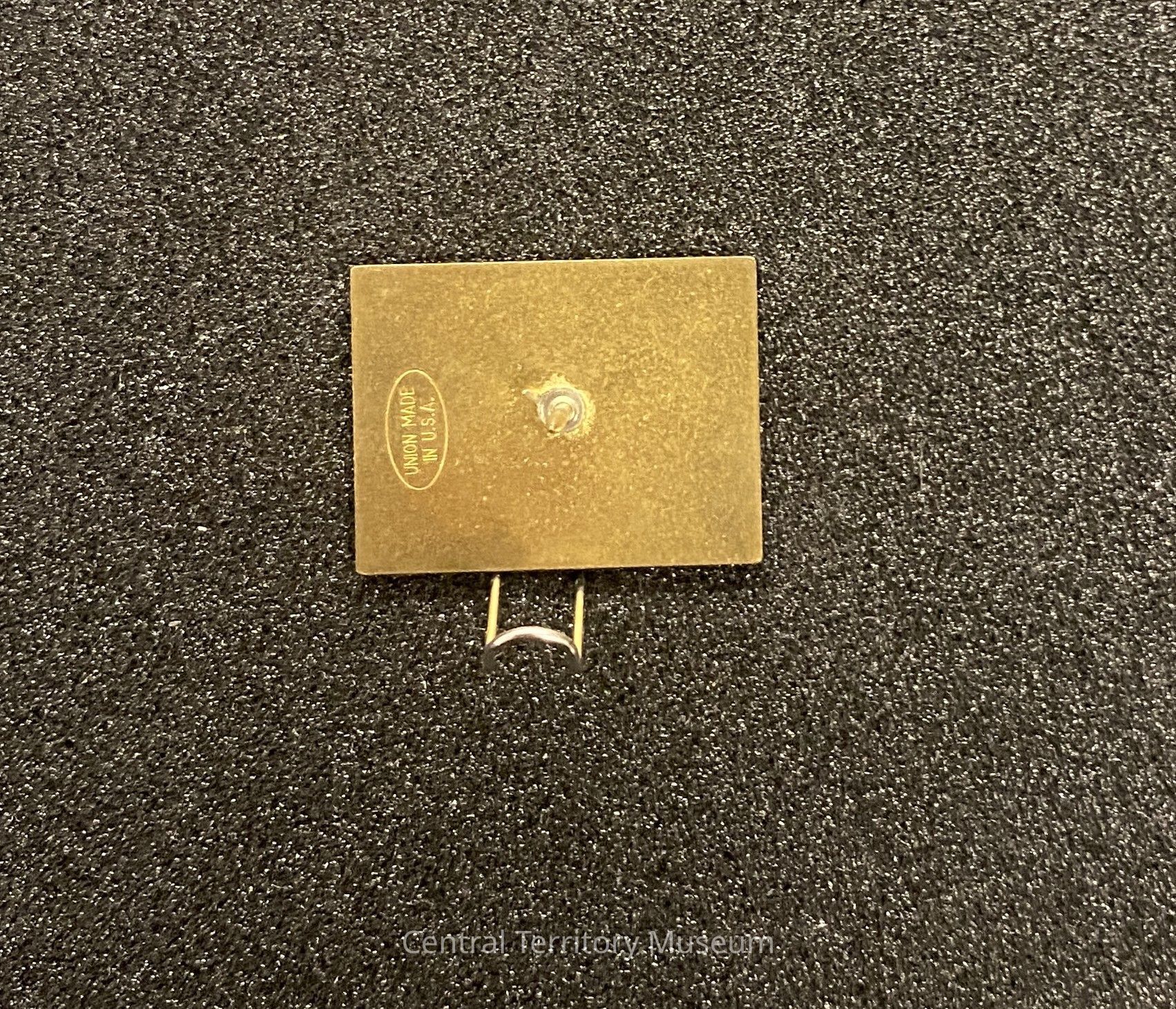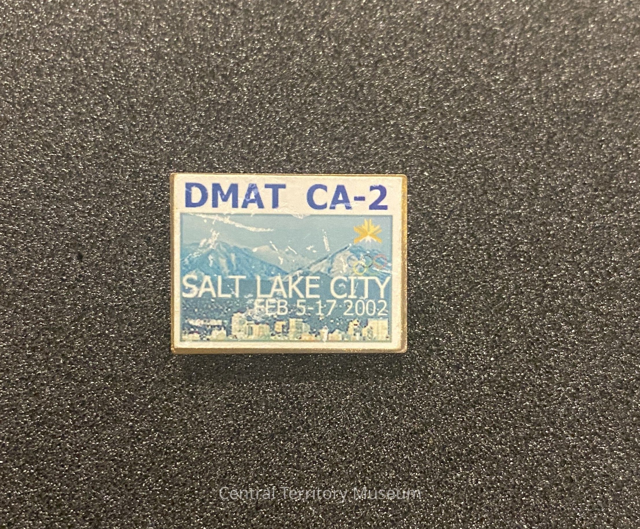 Metal and enamel pin created for the 2002 Winter Olympics held at Salt Lake City, Utah. The rectangular pin has a gold colored border around a graphic of a city skyline at the base, snow covered mountains, and white text Salt Lake City Feb 5-17 2002. The Salt Lake 2002 logo and Olympic Rings in color are printed on the right side of the cityscape. Dark blue text DMAT CA-2 is inscribed on a white background across the top of the pin.