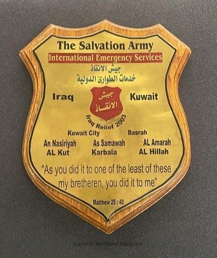 Shield shaped wood plaque with a gold colored metal plate. The text on the shield is in both English and Arabic. The title, The Salvation Army, is printed in black near the top edge with International Emergency Services in gold on a red rectangle below it. Just below that, in grayish blue, is the same title in Arabic. A red shield with Arabic text on it is in the center, flanked by Iraq on the left and Kuwait on the right with the text Iraq Relief 2003 arcing upwards at the base of the shield. Just below that is a listing of locations in Iraq and Kuwait: Kuwait City / Basrah / An Nasiriyah / As Samawah / AL Amarah / AL Kut / Karbala / AL Hillah. A Bible verse, Matthew 25 : 40 is printed below this.Acquisition