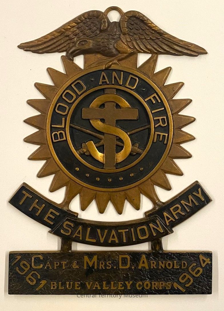 Bronze plaque with Blood and Fire crest with eagle and scroll, awarded to Captain and Mrs. Donald Arnold for their service with the Kansas City (Blue Valley) Corps. Their names, the corps name, and the dates are engraved on a plaque in the lower section.