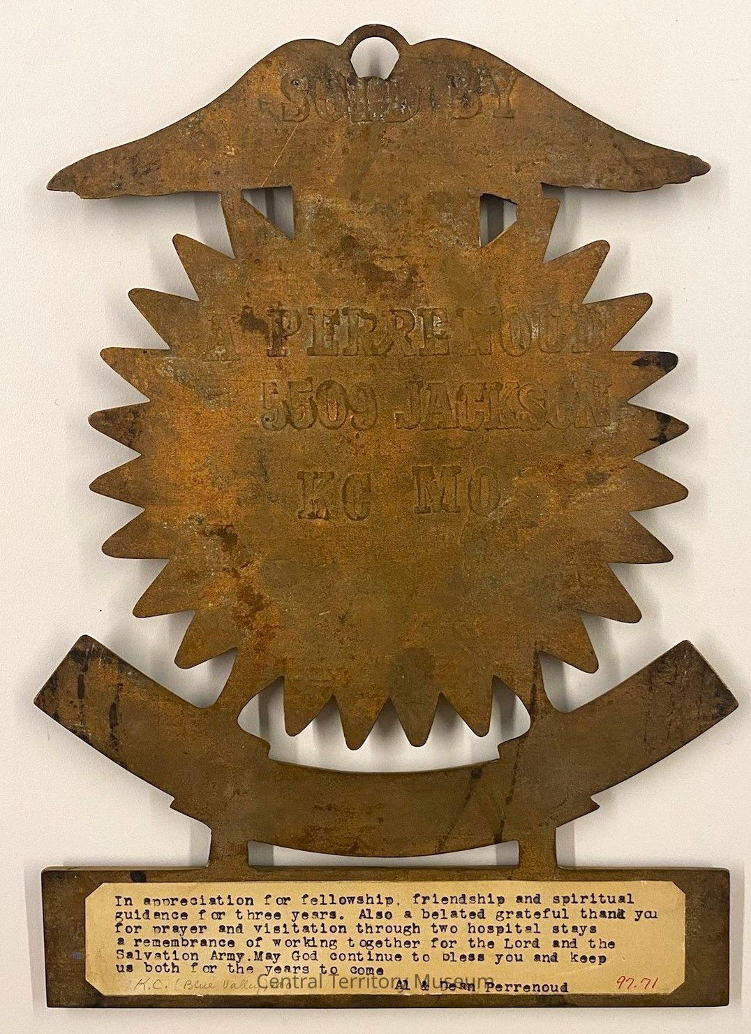 A note, adhered to the back, reads In appreciation for fellowship, friendship and spiritual guidance for three years. Also a belated grateful thank you for prayer and visitation through two hospital stays, a remembrance of working together for the Lord and the Salvation Army. May God continue to bless you and keep us both for the years to come. Al & Dean Perrenoud.Acquisition