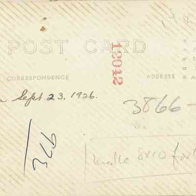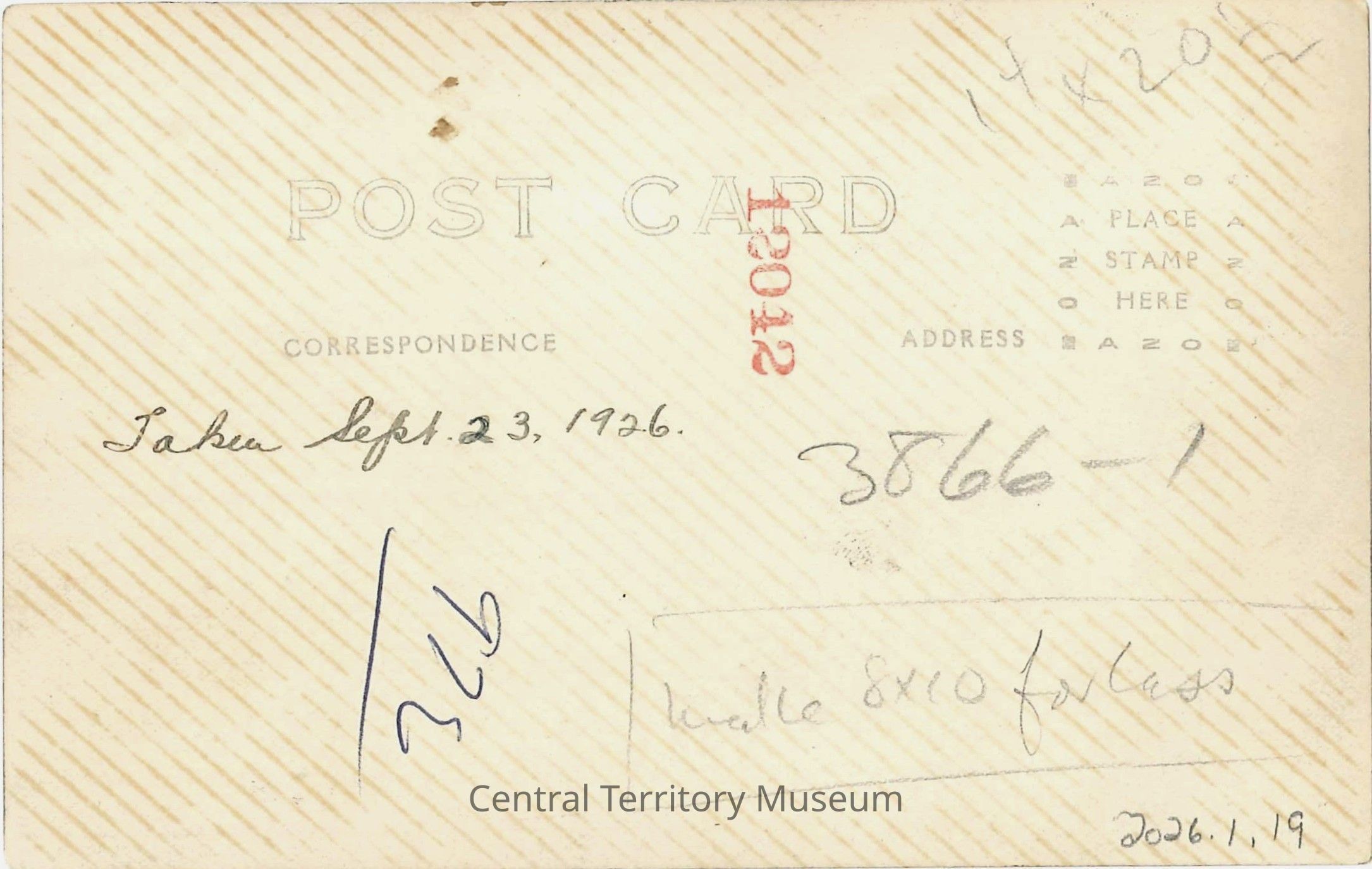 The back of the postcard has two sections titled Correspondence and Address, but no line separates the sections. The stamp box has AZO printed on each side of the square, "place stamp here" inside the box, and there is a square in each corner. A handwritten note reads: Taken Sep 23, 1926.Acquisition