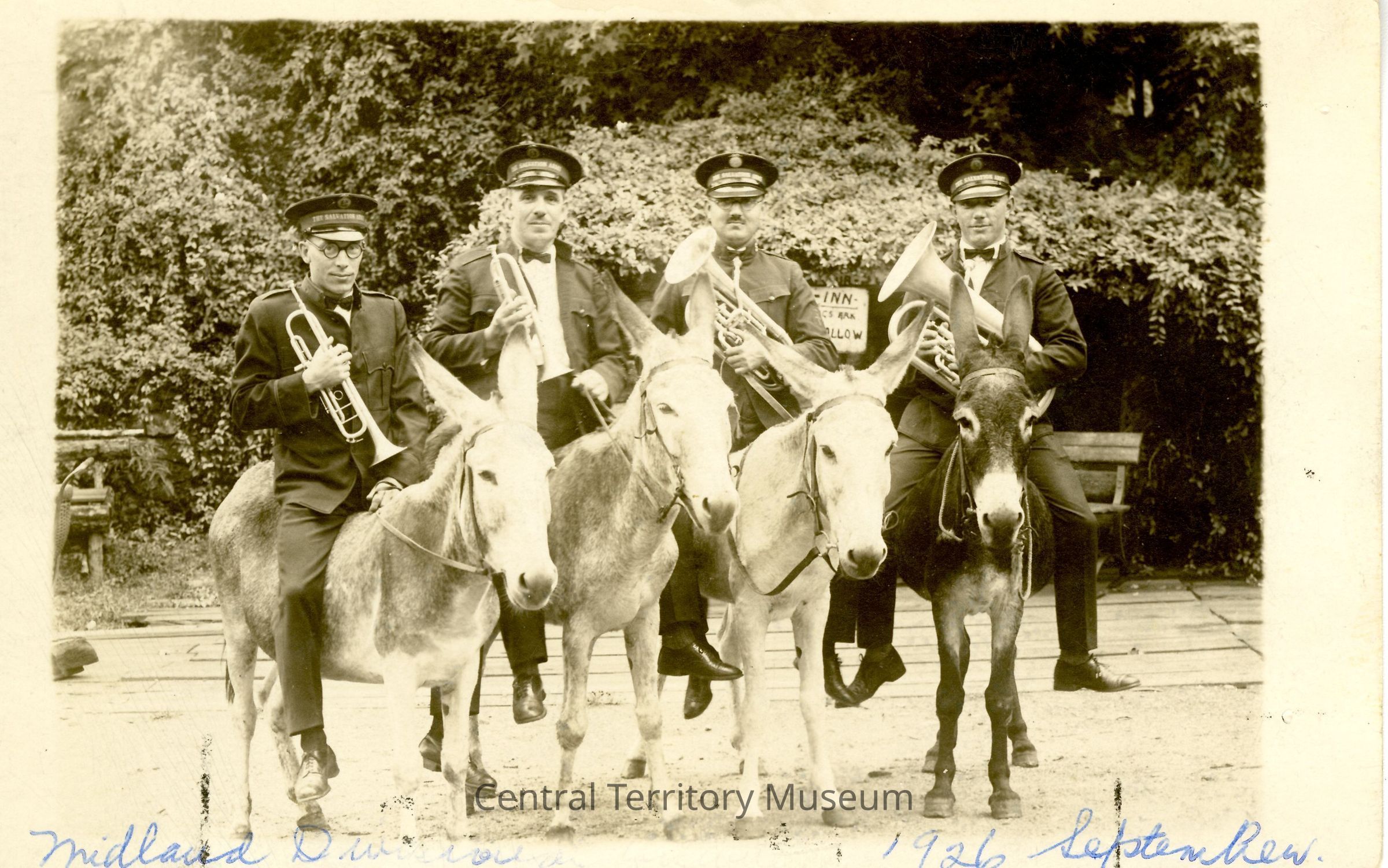 Postcard, with black-and-white image of four male Salvationists, holding brass musical instruments, seated astride donkeys. A handwritten inscription, in blue ink, is across the bottom of the photo and reads: Midland Division 1926 September.