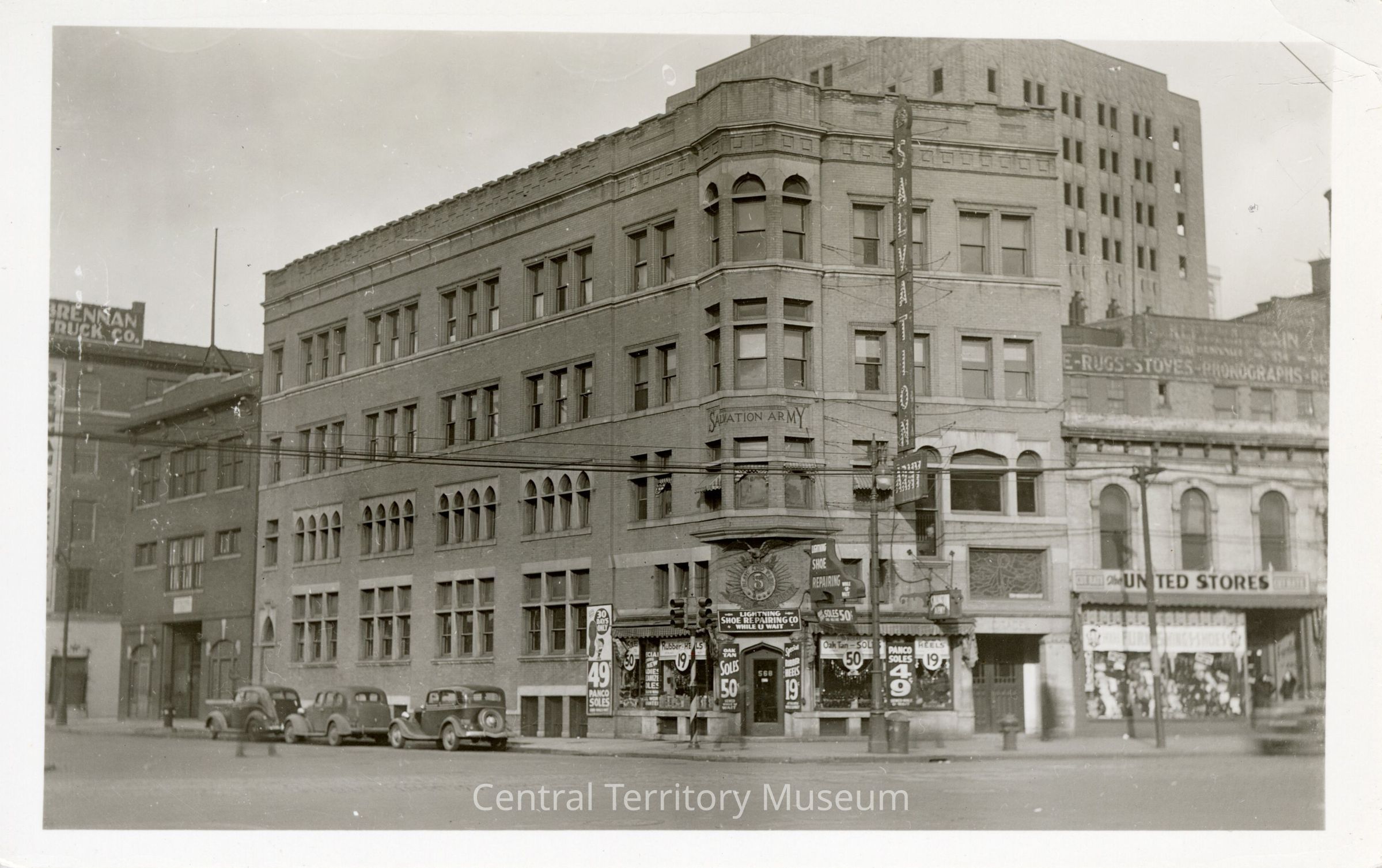 Postcard with a black-and-white photo of the Detroit (Citadel), MI Corps building, possibly on Michigan and Second Avenues. The four (plus) story brick building is on a corner lot and has a corner turret. The Salvation Army crest, with eagle, is seen under the turret. Signs for a shoe repair shop are under the crest. To the right, a large stained glass window can be seen over a double door entry, marking the entrance to the Citadel. A large electric sign is attached to this side of the building. The cars on the street appear to be from the1930s.Acquisition