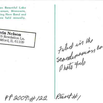 The back of the postcard has a short blurb about the location which reads: "Harmony Lodge on Beautiful Lake Hanging Horn, Barnum, Minnesota, where Lake Hanging Horn Band and Church Camps are held annually." There is no information about the publisher or photographer.