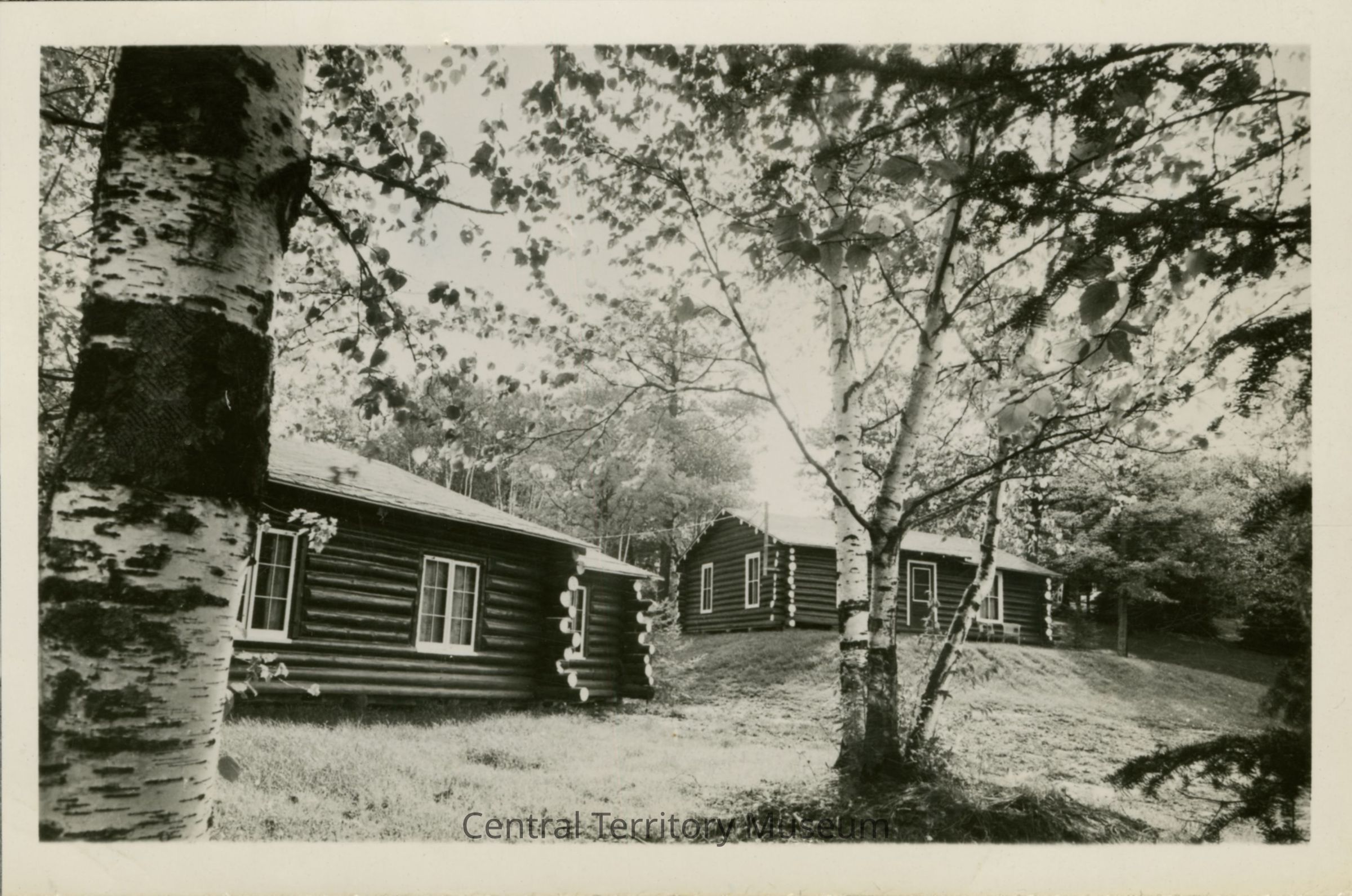 Photo postcard. The black and white image depicts a group of log cabins at Lake Hanging Horn in Barnum, Minnesota. Birch trees can be seen on the foreground with lawn between each building.