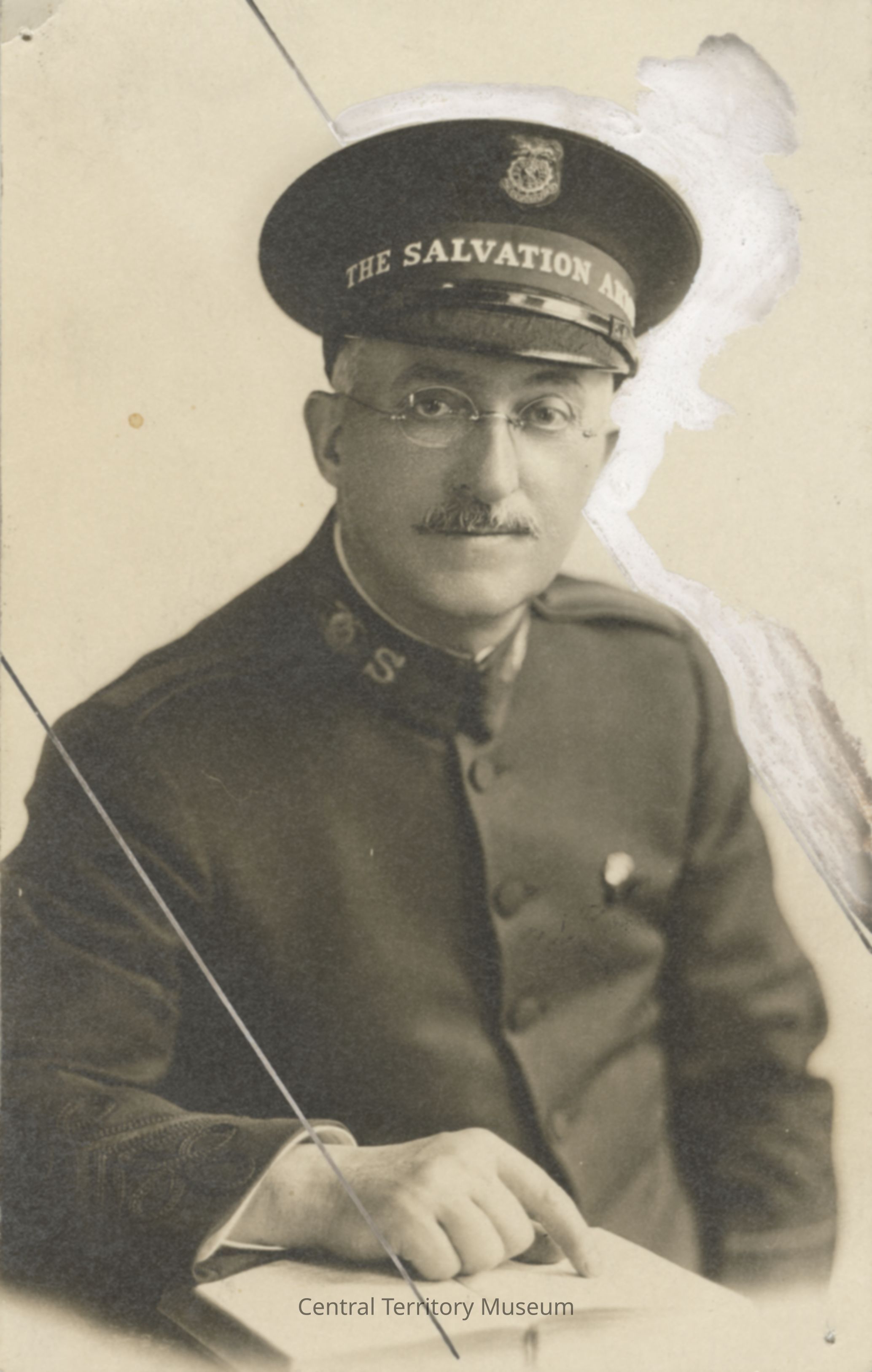 Postcard with black & white photo of Brigadier Joseph Sheppard. He is seated, with his right hand resting on a open book. The image appears to have the background erased and is slightly blurred on the right side. He is wearing eyeglasses and has a small mustache.