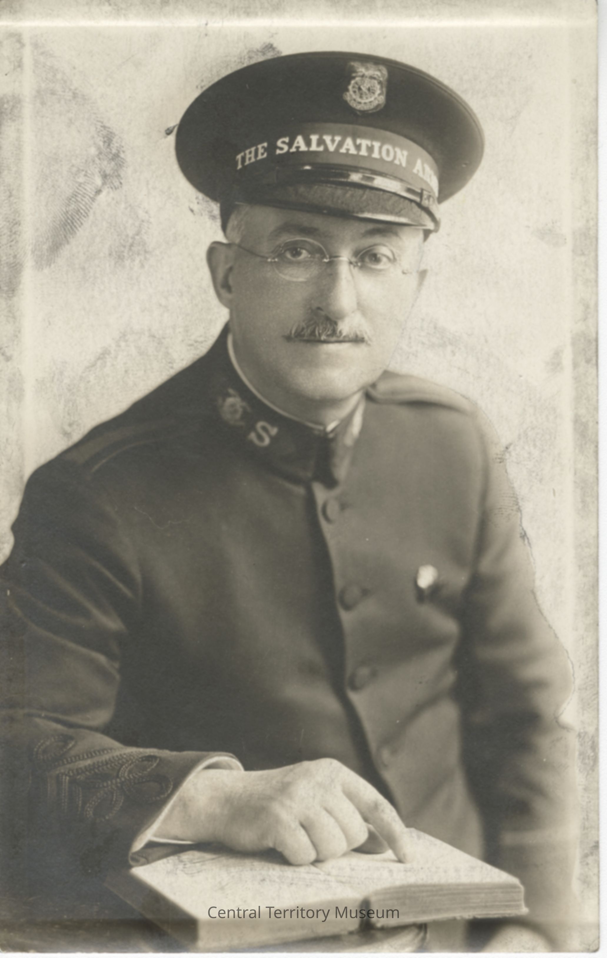 Postcard with black & white photo of Brigadier Joseph Sheppard. He is seated, with his right hand resting on a open book. The image appears to have the background erased and is slightly blurred on the right side. He is wearing eyeglasses and has a small mustache. There are several editing lines in the image.