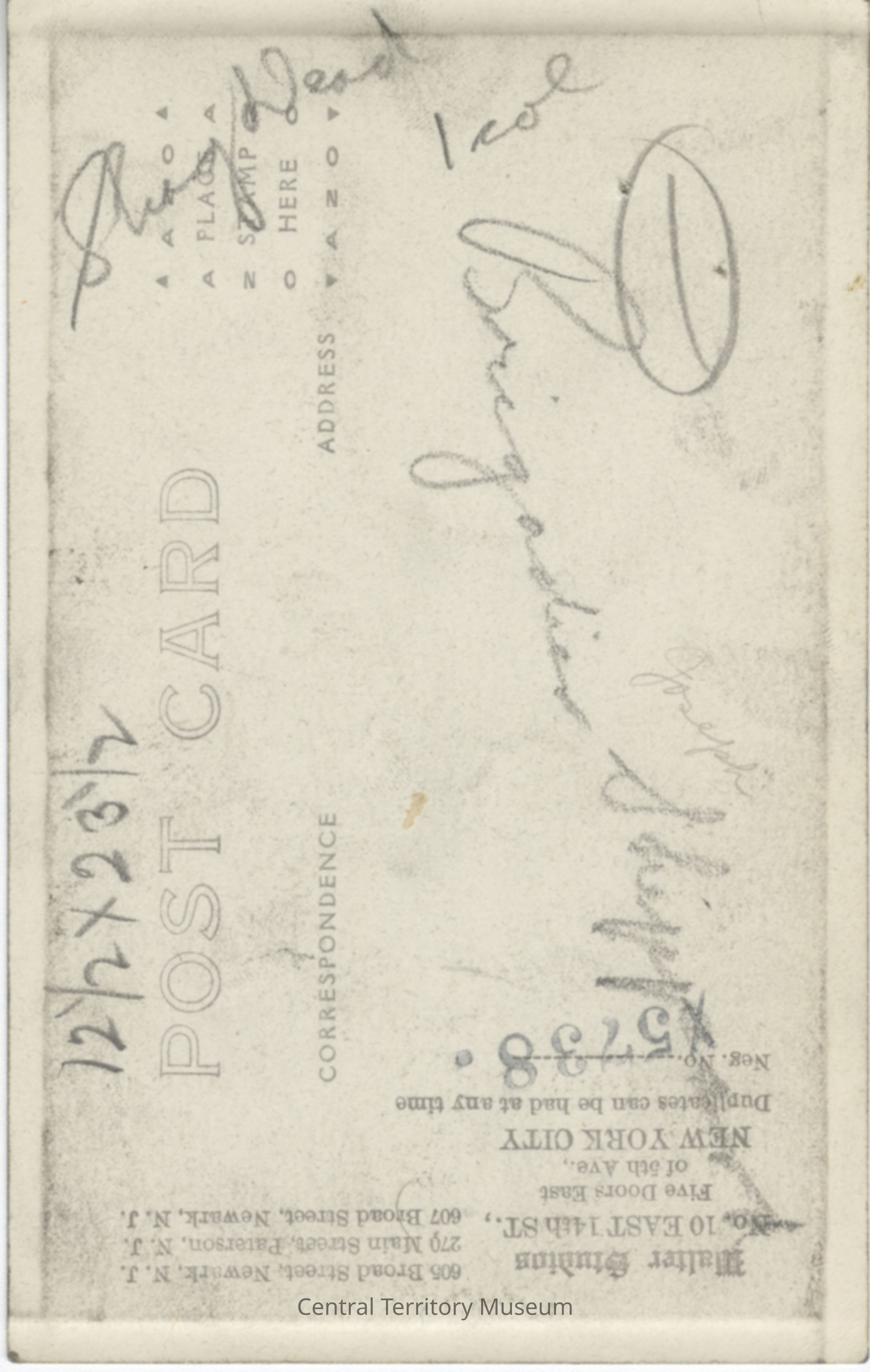 The back of the postcard is stamped with the name Walter Studios with all of its locations in New York City and in New Jersey. The publisher, CYKO, is printed in the stamp box.